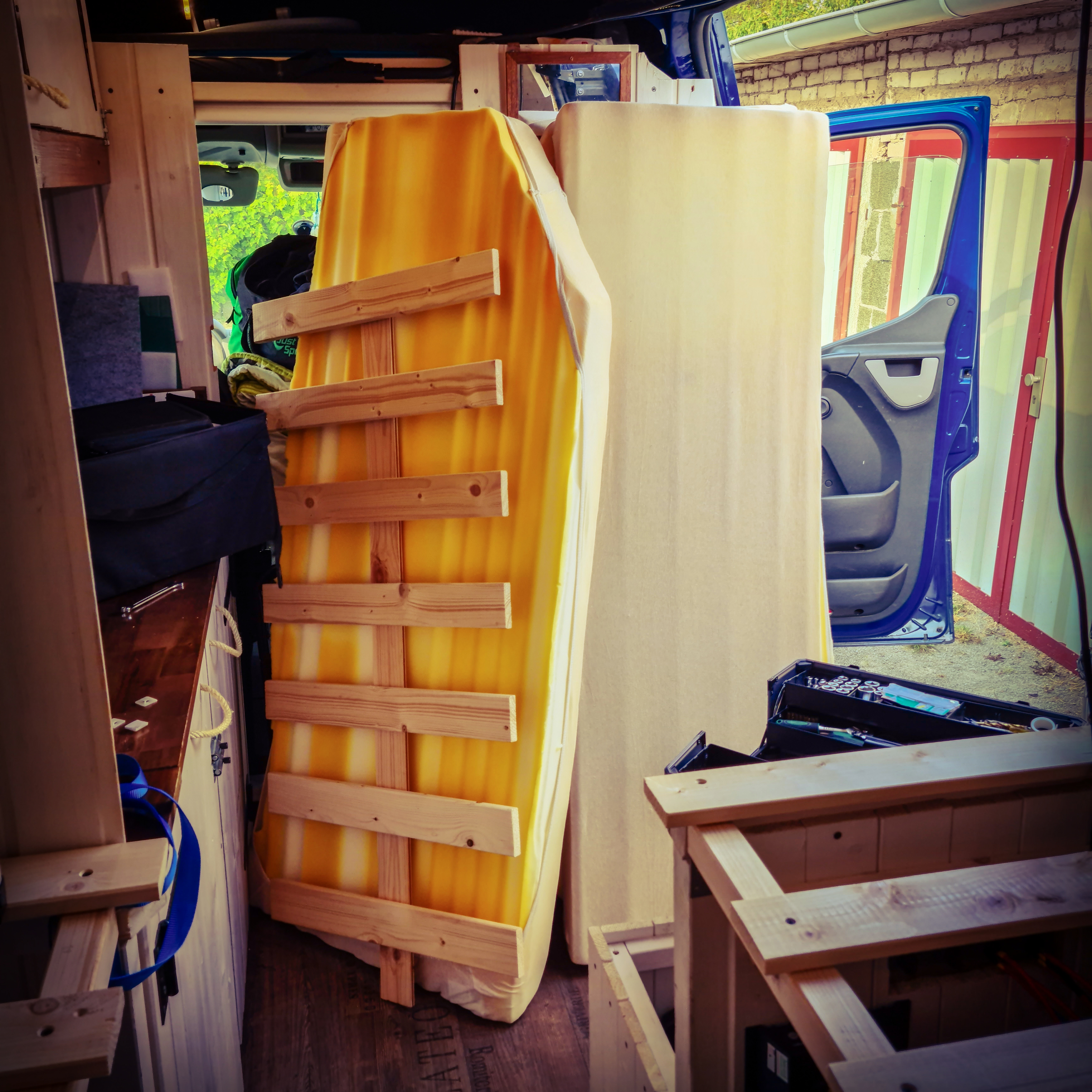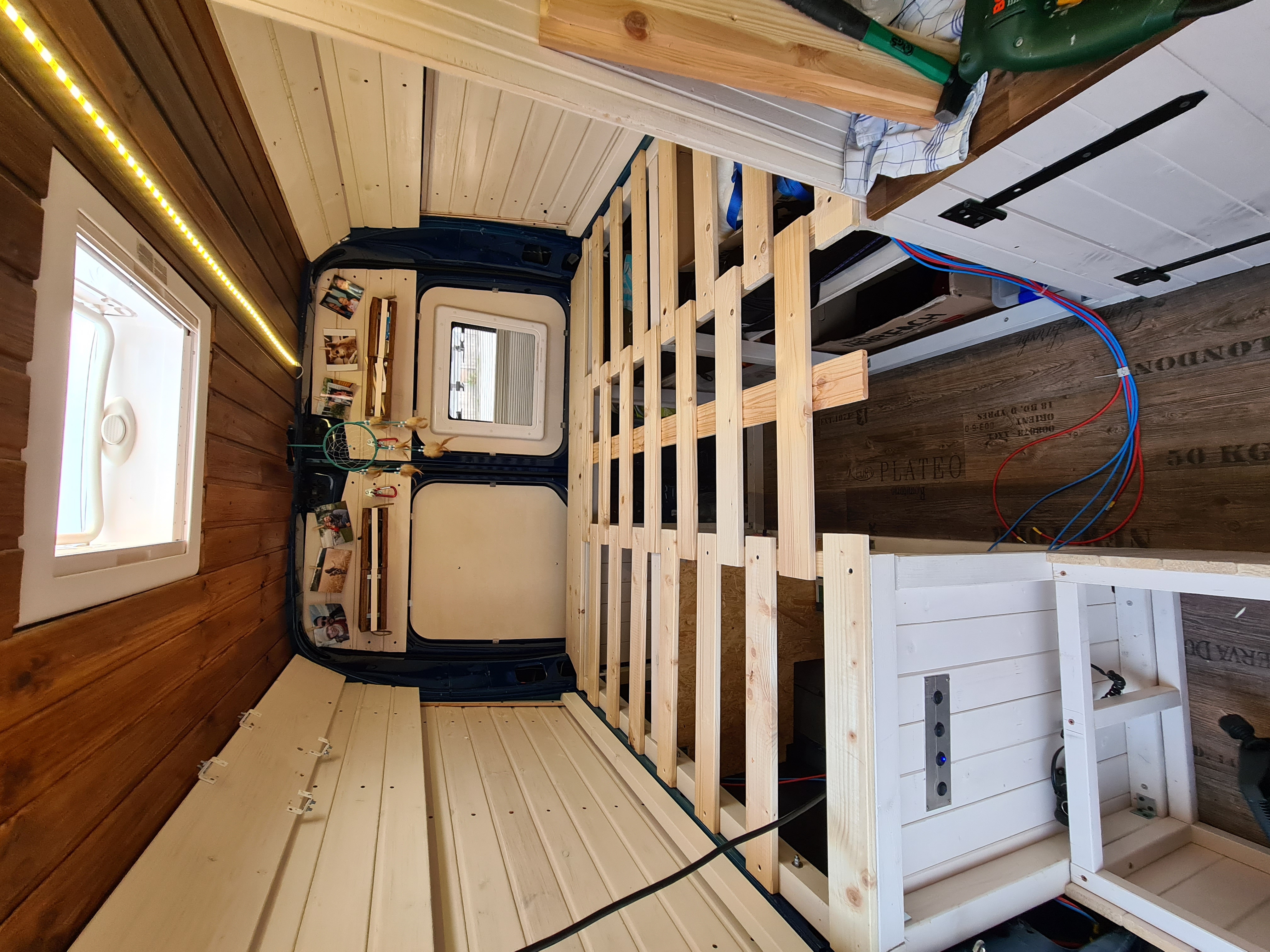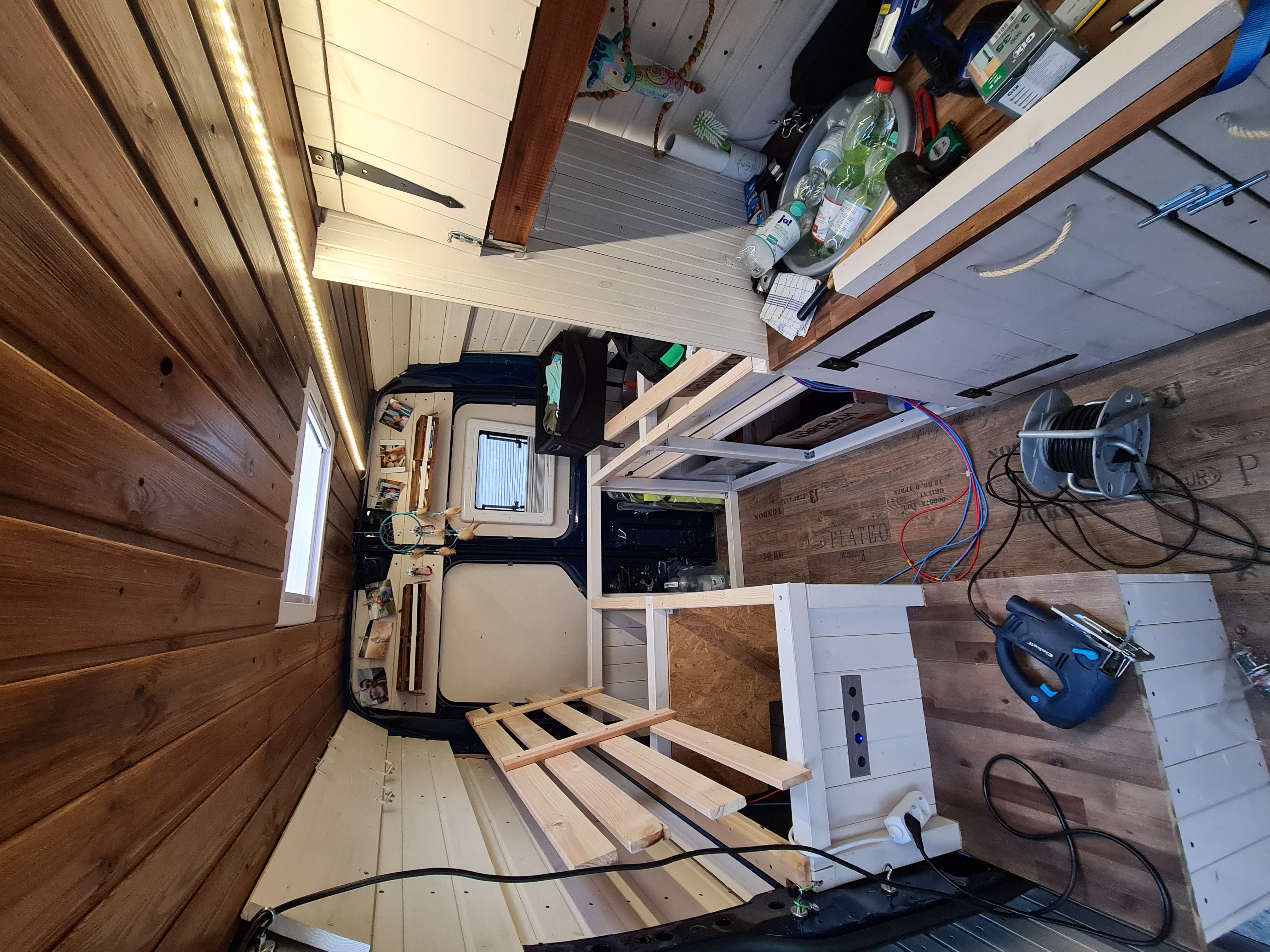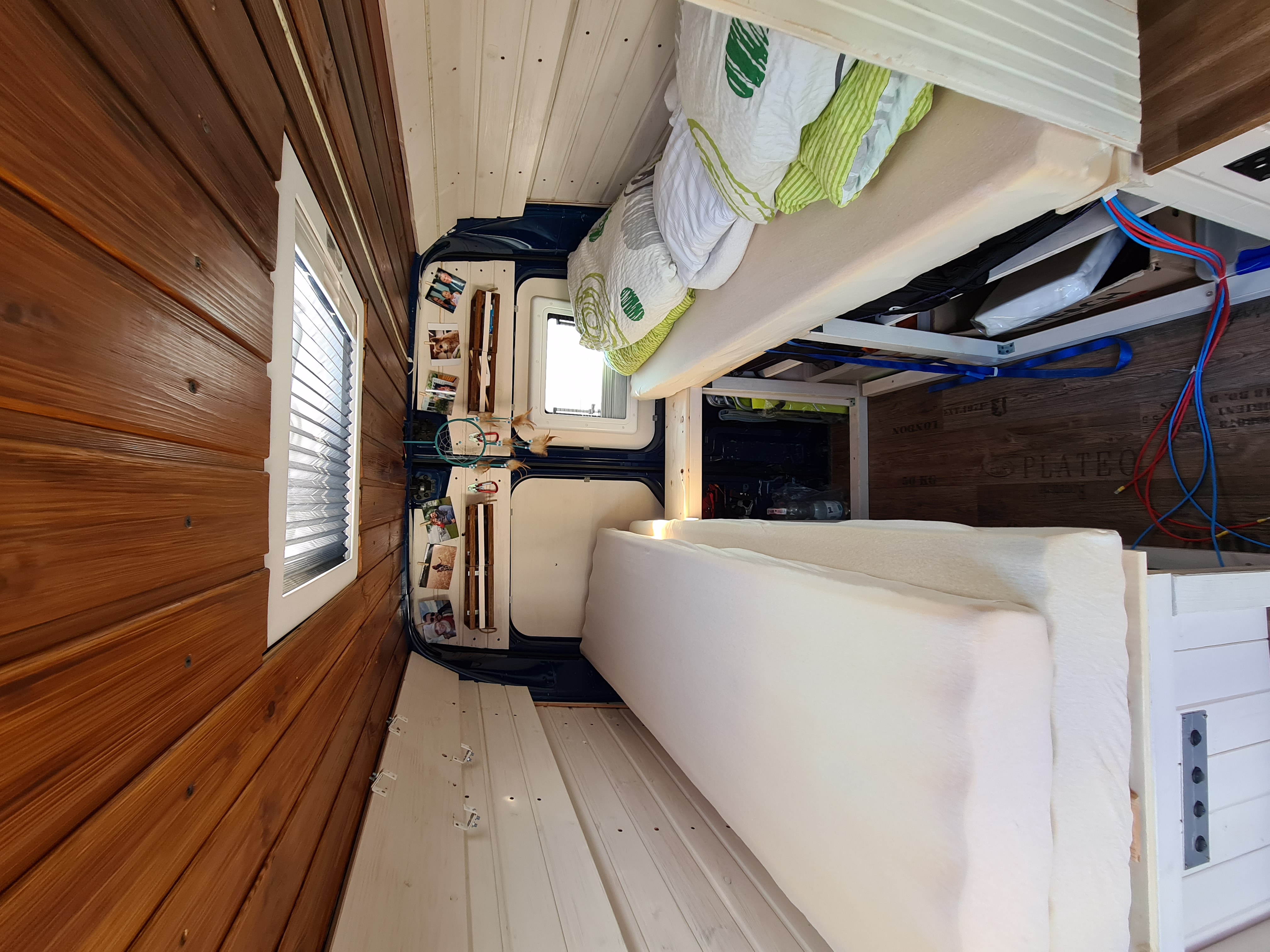 Das Bett wurde dann 2021 nochmal optimiert. Ich habe den Durchgang aufgemacht, damit man das Bett auch mal beiseite tun kann und der Gang begehrbar wird.