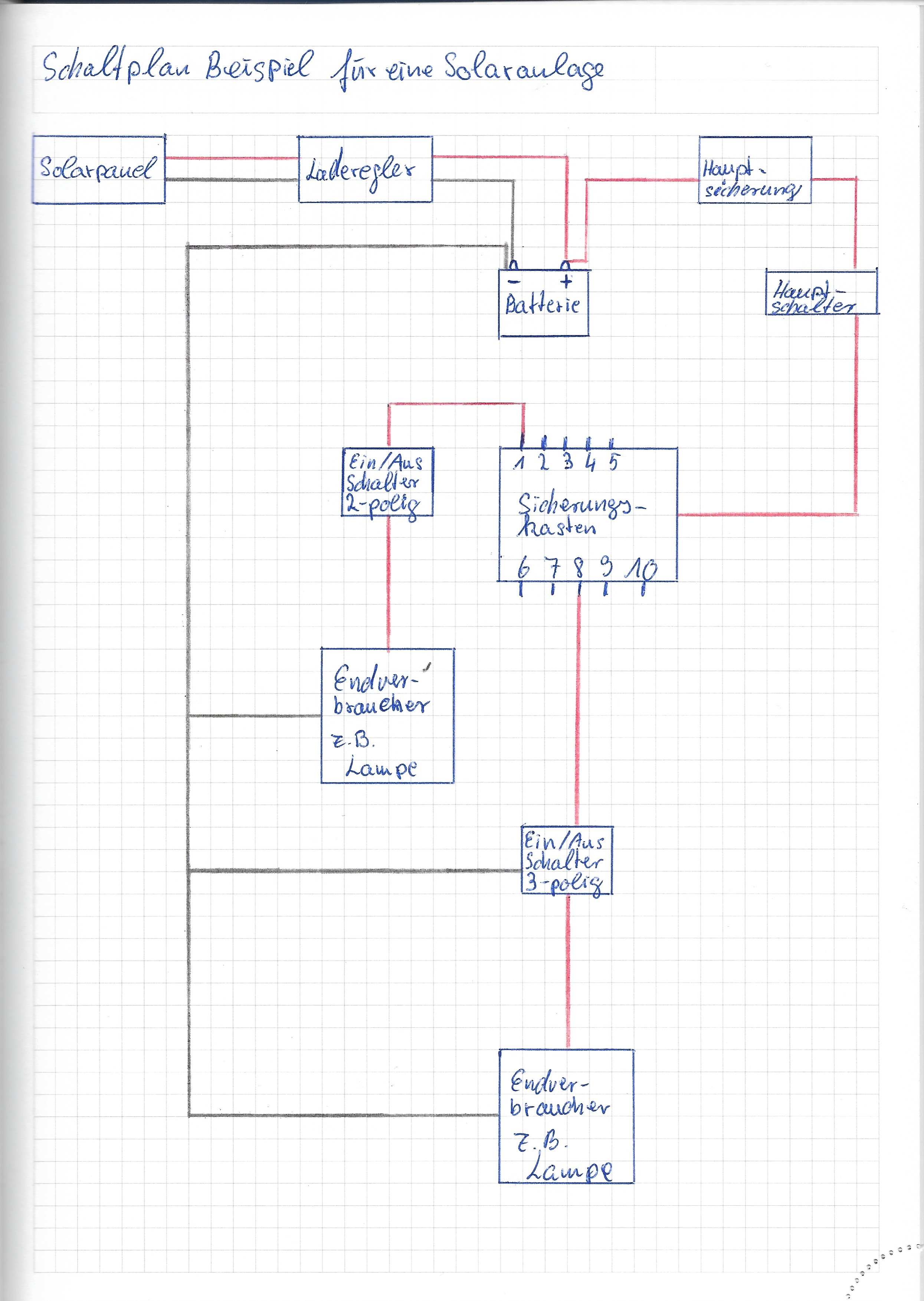 Das sieht auf den ersten Blick erstmal nach viel aus, gehört aber bis auf den Wechselrichter zur absoluten Grundausstattung für dieses Vorhaben. Da ich ja wie oben bereits erwähnt weder zusätzlich an die Autobatterie gehe, noch einen Landstromanschluss habe, fehlen hier natürlich einige Dinge. Auch mein Schaltplan ist dadurch etwas einfacher gestrickt (: