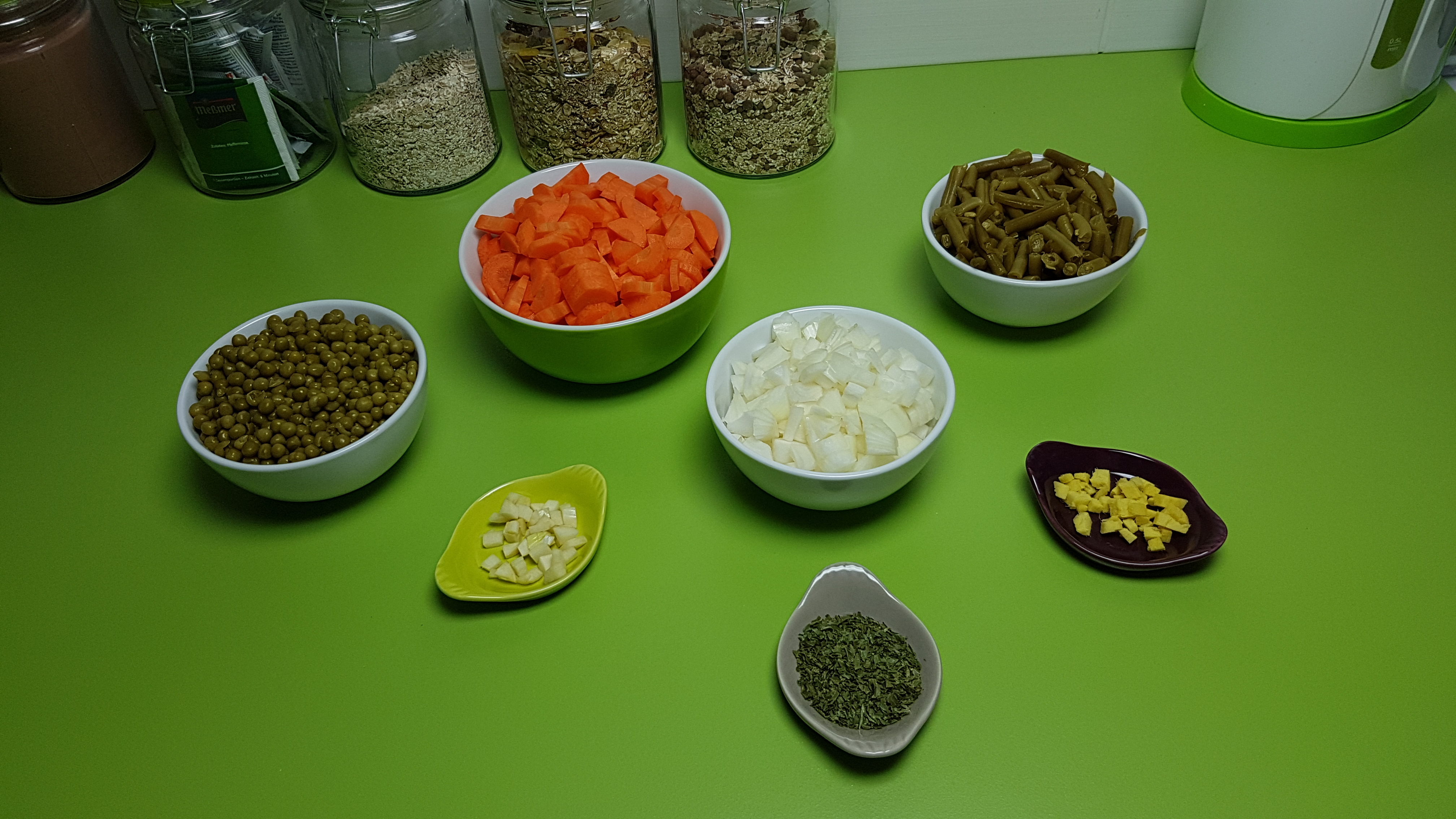 Als erstes Karotten, Zwiebeln und Knoblauch Schälen und zerkleinern. Bohnen, Erbsen, Karotten und den Blumenkohl in eine Pfanne oder einen Topf geben, ein bisschen Wasser dazu, Deckel drauf und auf die höchste Stufe stellen.