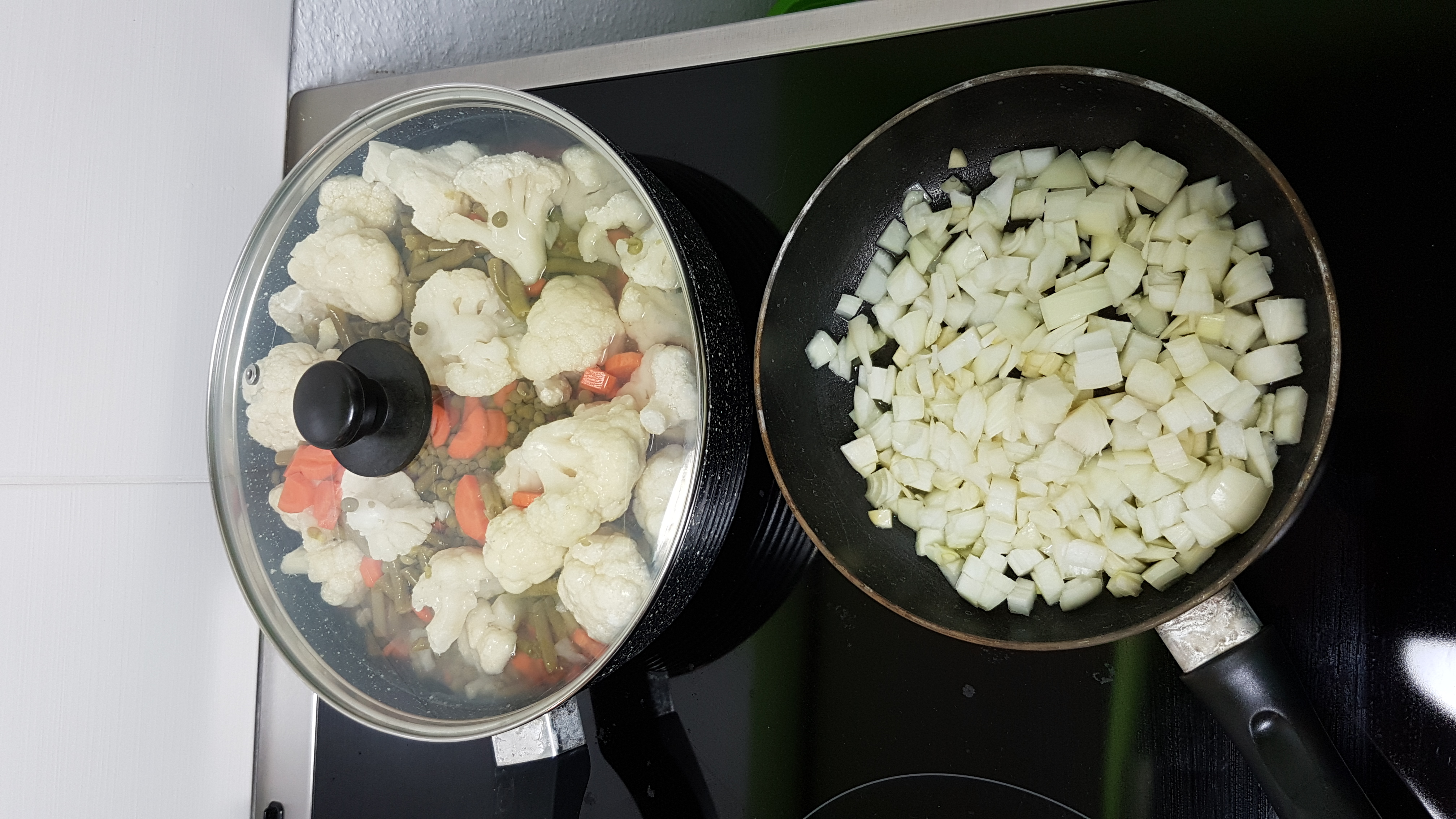 Als erstes Karotten, Zwiebeln und Knoblauch Schälen und zerkleinern. Bohnen, Erbsen, Karotten und den Blumenkohl in eine Pfanne oder einen Topf geben, ein bisschen Wasser dazu, Deckel drauf und auf die höchste Stufe stellen.