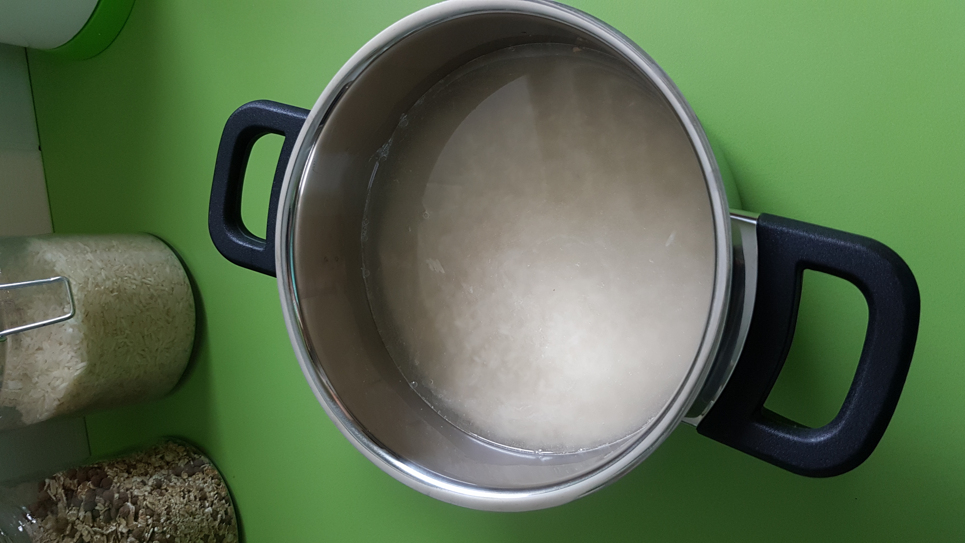Jetzt je nach Personenanzahl den Reis mit einer Küchenwaage abwiegen, bei uns waren es 400g und in einen Topf geben, nun soviel Wasser hinzugeben das der Reis eine Daumenbreite mit Wasser bedeckt ist. Deckel drauf, kurz auf die höchste Stufe stellen und warten bis sich weißer Schaum bildet der gegen den Deckel spritzt, nun die Herdplatte ausmachen den Topf vom Herd nehmen, die Platte ein wenig abkühlen lassen und erst dann den Topf wieder auf den Herd stellen (so das es nicht mehr anfängt zu kochen). Den Reis bei geschlossenem Deckel mindestens 20 Minuten stehen lassen, NICHT umrühren und KEINESFALLS den Deckel zwischendurch abnehmen! Bitte haltet euch auch an die Daumenbreite Wasser über dem Reis!