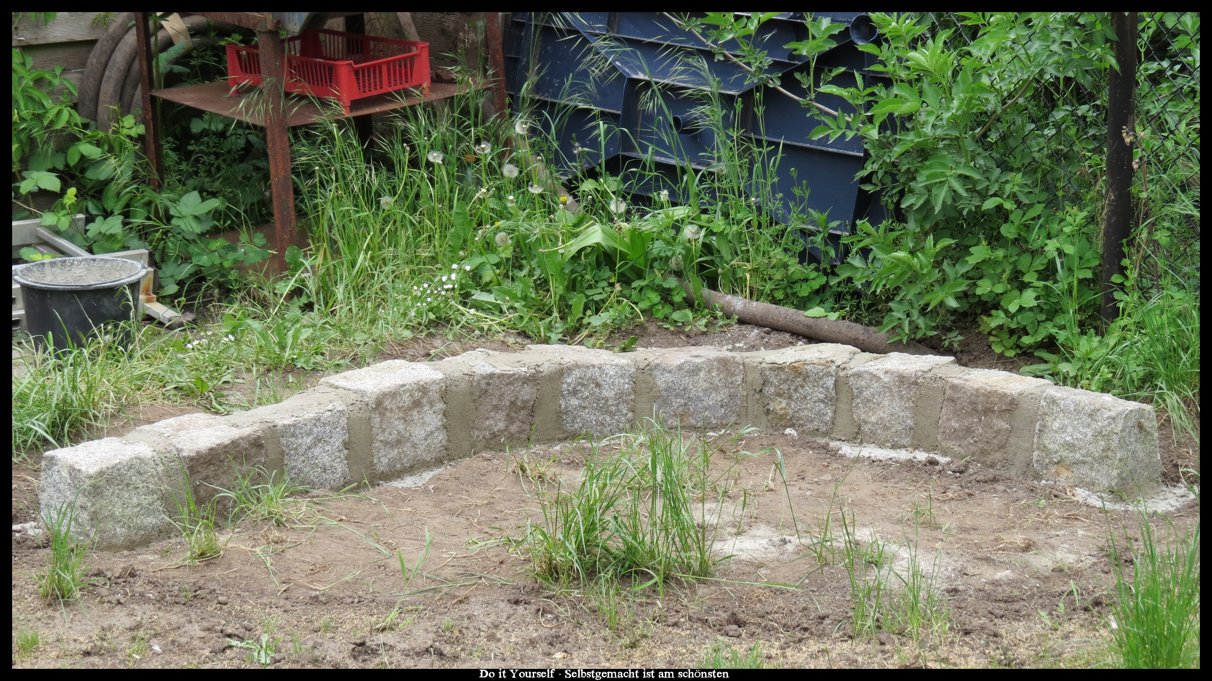 Dazu habe ich einfach eine Spatenbreite/-tiefe ausgehoben, ein paar alte Steine reingeschmissen und dann mit Estrichbeton ausgegossen. das ganze habe ich dann ca. eine Stunde anziehen lassen und die erste Schicht Granitsteine drauf gesetzt, damit das Fundament gleich ein wenig die Form der Steine annimmt. Danach habe ich dann immer mit ein paar Stunden Aushärtungszeit Stein auf Stein gesetzt, dazwischen immer Estrichbeton geschmiert und von außen geglättet.