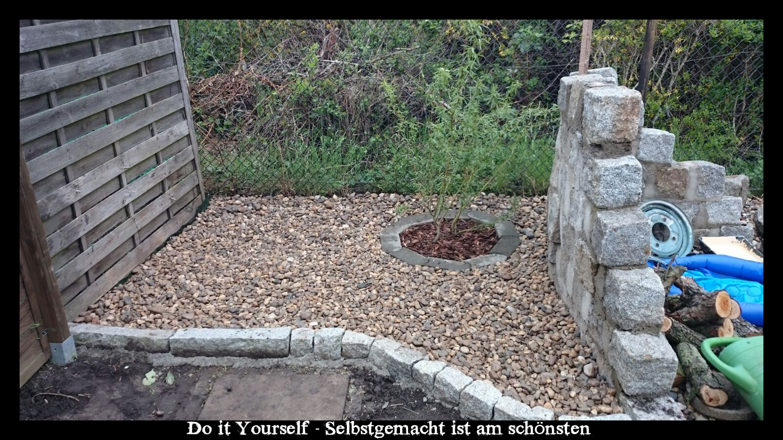 Um die Mauer herum und entlag der Zaunˋs habe ich dann alles mit einer Plane ausgelegt um das Unkraut zu minimieren. Hinter der Mauer habe ich eine Korkenzieherweide gepflanzt, denn wenn diese mal größer ist, wird Sie mit ihren Zweigen über die Mauer ragen, was dem ganzen eine einzigartige Idylle verleiht.