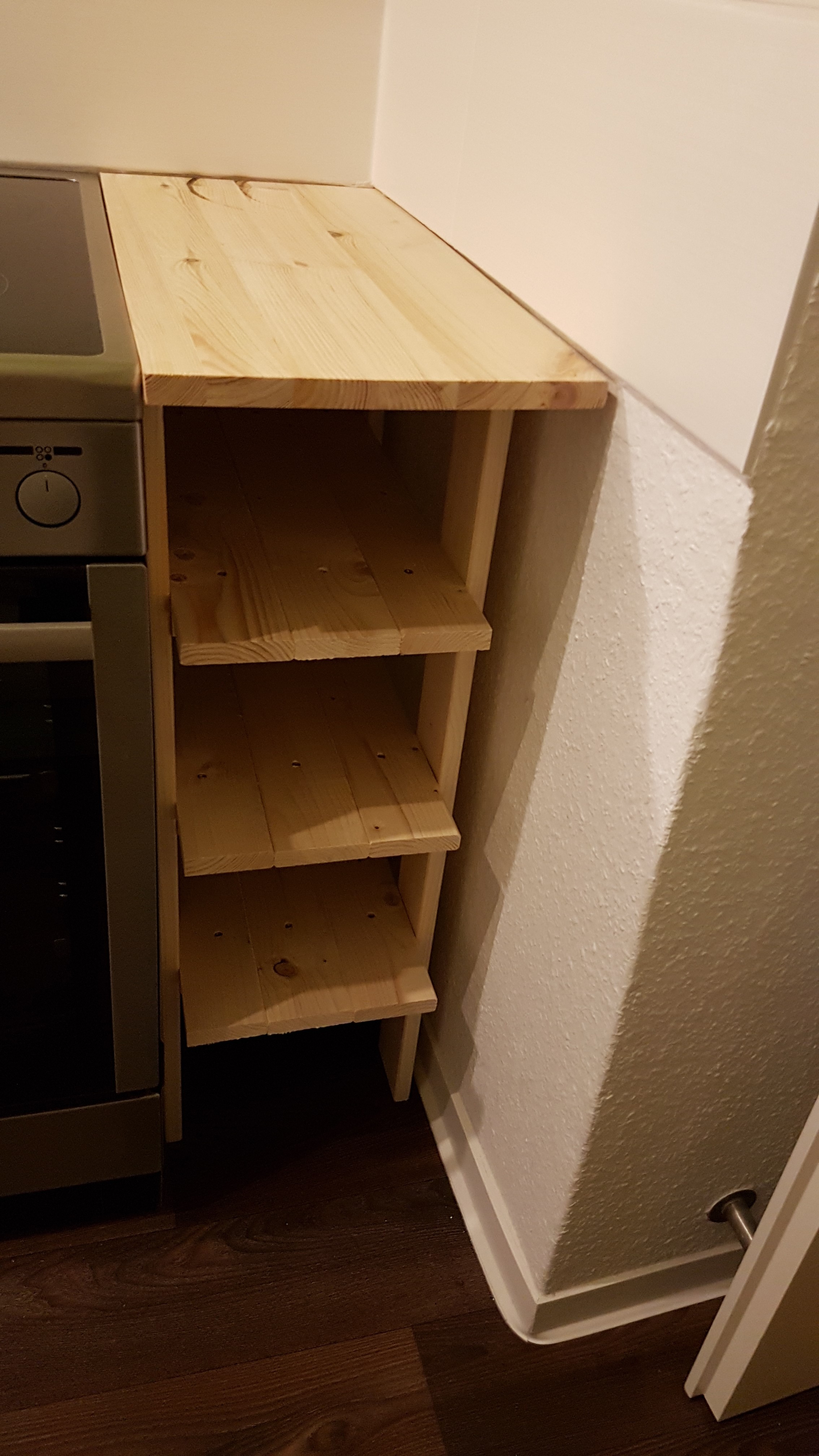 Wenn man keine Maßgeschneiderte Designerküche besitzt, hat man oft das Problem, das nach dem Möbelrücken immer irgendwo eine kleine Lücke bleibt. So war es auch bei mir zwischen Herd und Wand. Fand ich voll blöd, also musste eine Lösung her.
