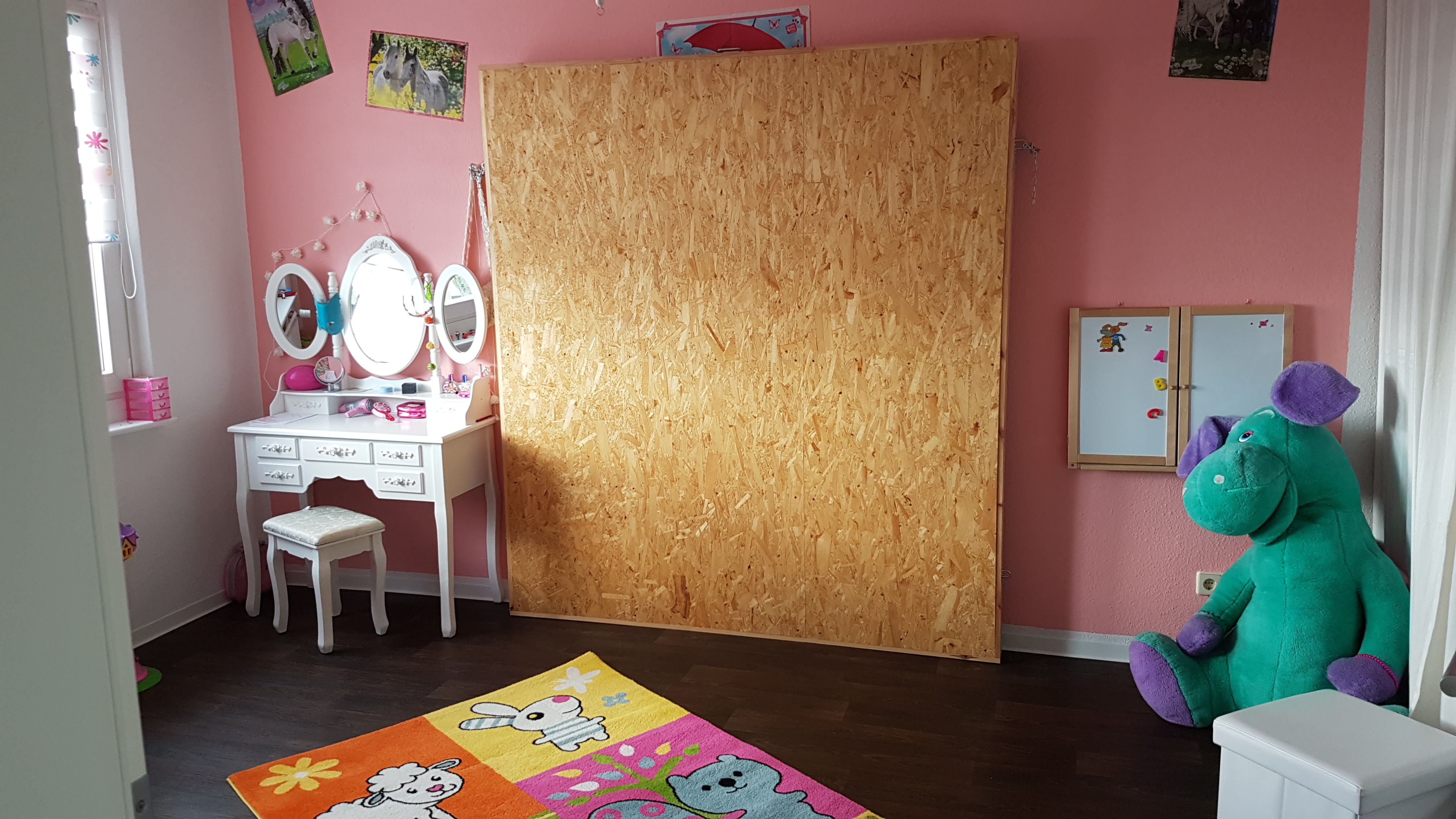 Mein erster Gedanke dazu war eine Deckenkonstruktion, diesen verwarf ich jedoch ganz schnell wieder, die Gefahr, das irgendetwas schief lĂ€uft und dann herunter kracht war mir zu groĂ, dennoch sollte das Bett tagsĂŒber nicht im Wege stehen.