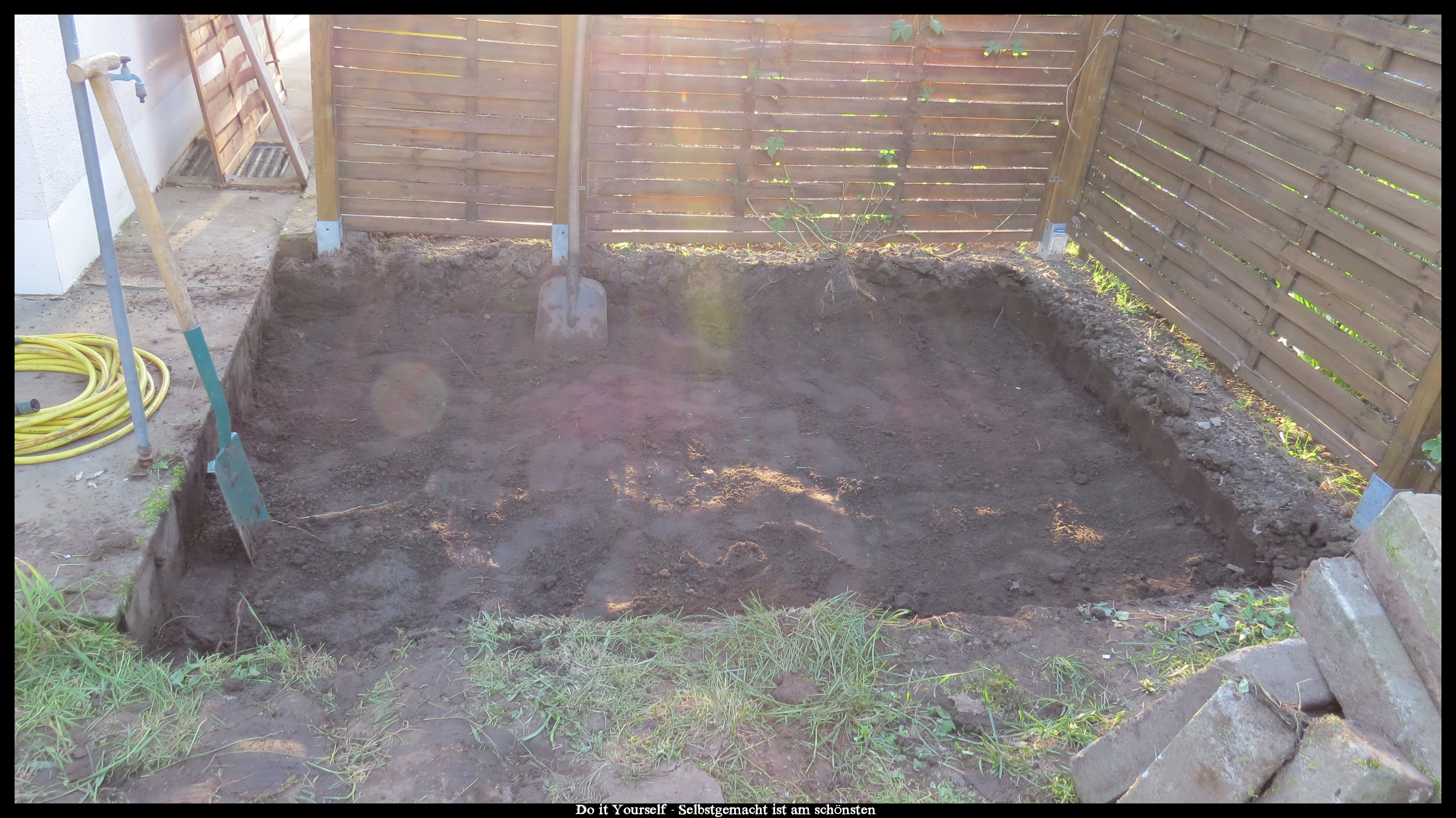 Gesagt getan, fix ca. 15 cm Erde ausgehoben, bissel platt getrampelt und alles was wir so an losen Steinen hatten hinein geschmissen. Nun musste ein Fundament her, so entschieden wir uns für Estrich-Beton, denn den muss man ja „nur“ noch mit Wasser anmischen und reinschütten. Im nach hinein ein sehr großer Fehler :D, denn wir brauchten 53 dieser Säcke mit jeweils 40 Kg.