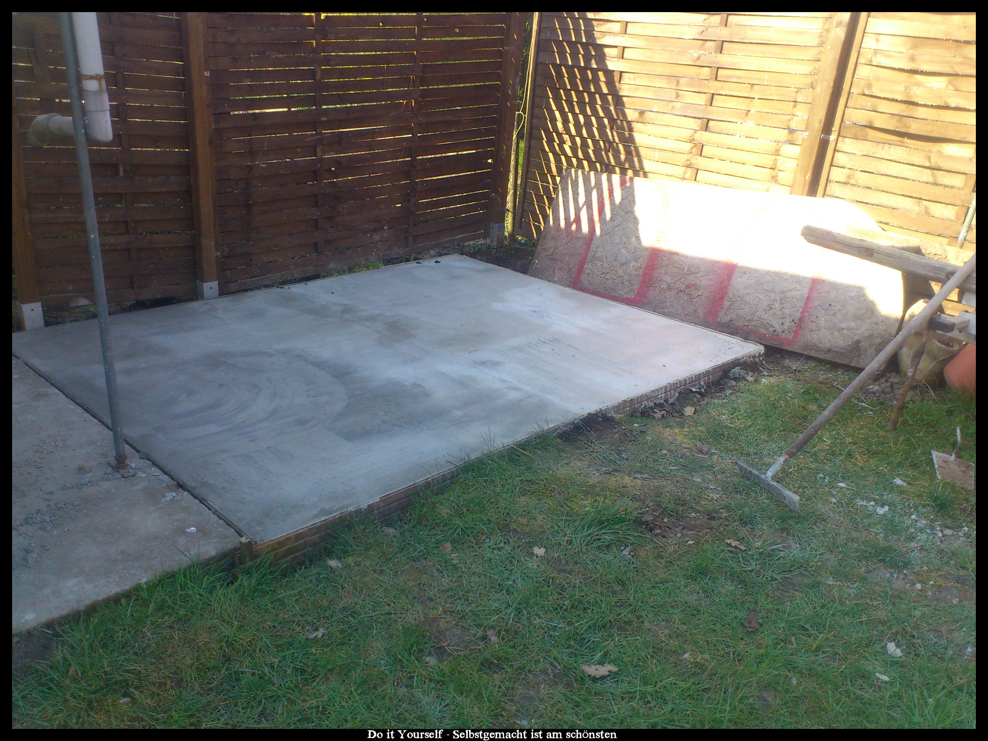 Gesagt getan, fix ca. 15 cm Erde ausgehoben, bissel platt getrampelt und alles was wir so an losen Steinen hatten hinein geschmissen. Nun musste ein Fundament her, so entschieden wir uns für Estrich-Beton, denn den muss man ja „nur“ noch mit Wasser anmischen und reinschütten. Im nach hinein ein sehr großer Fehler :D, denn wir brauchten 53 dieser Säcke mit jeweils 40 Kg.