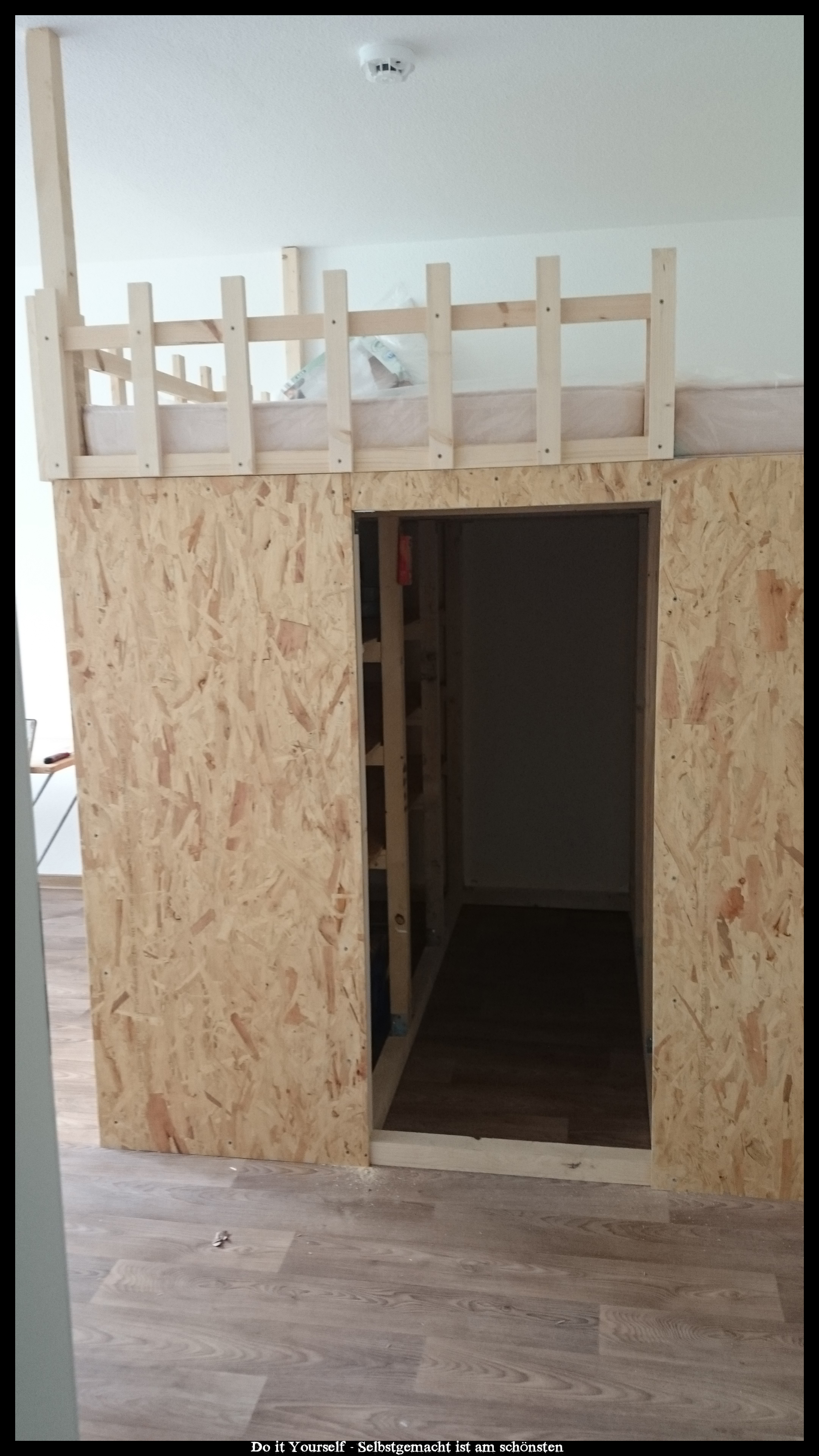 Die Regalböden bestehen aus 12mm OSB Platten, auf der anderen Seite haben wir einfach Löcher in die Querstreben gebohrt einen Besenstiel durchgesteckt, schon hatten wir eine Kleiderstange für die Bügel.