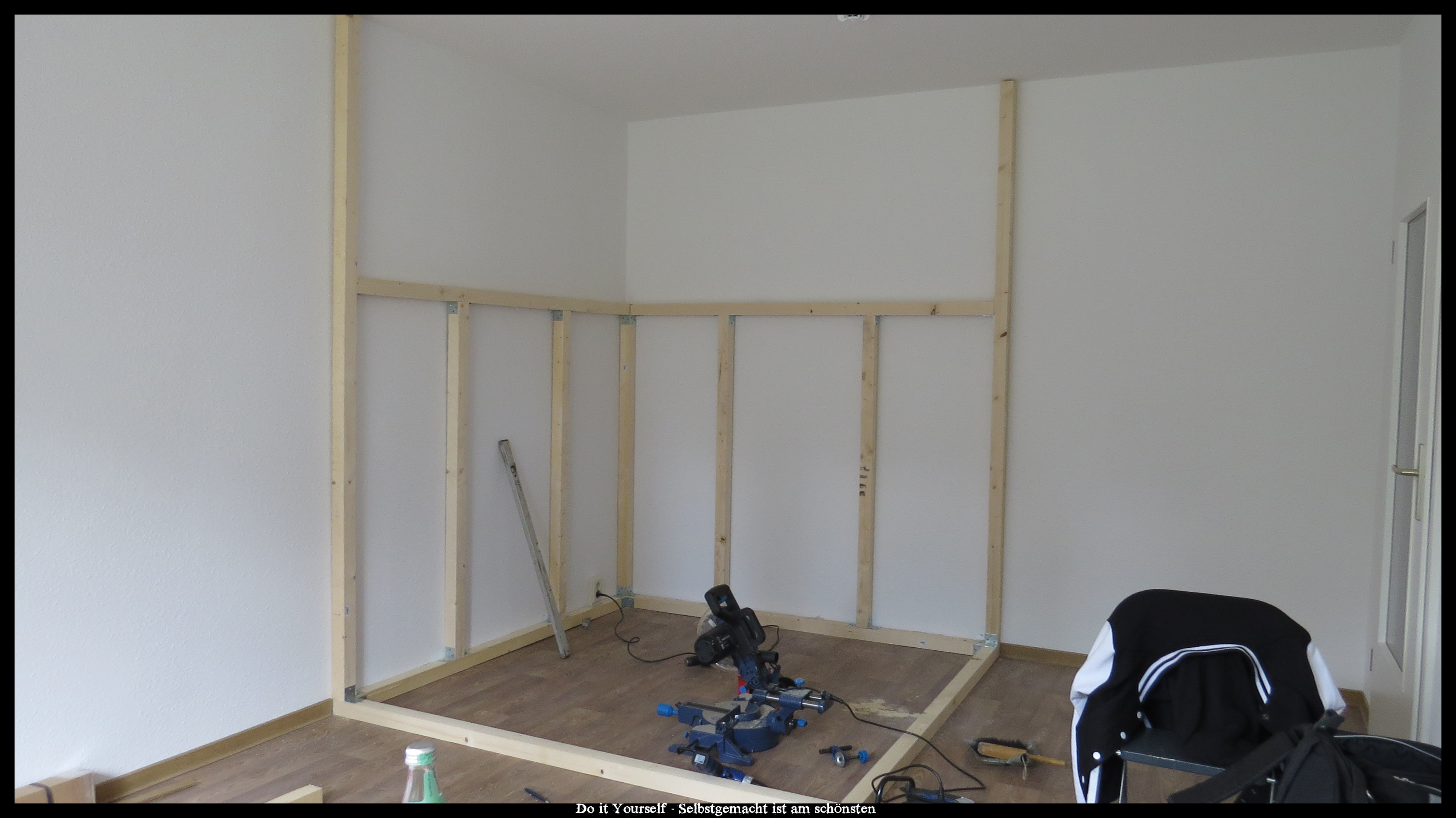 Die Regalböden bestehen aus 12mm OSB Platten, auf der anderen Seite haben wir einfach Löcher in die Querstreben gebohrt einen Besenstiel durchgesteckt, schon hatten wir eine Kleiderstange für die Bügel.