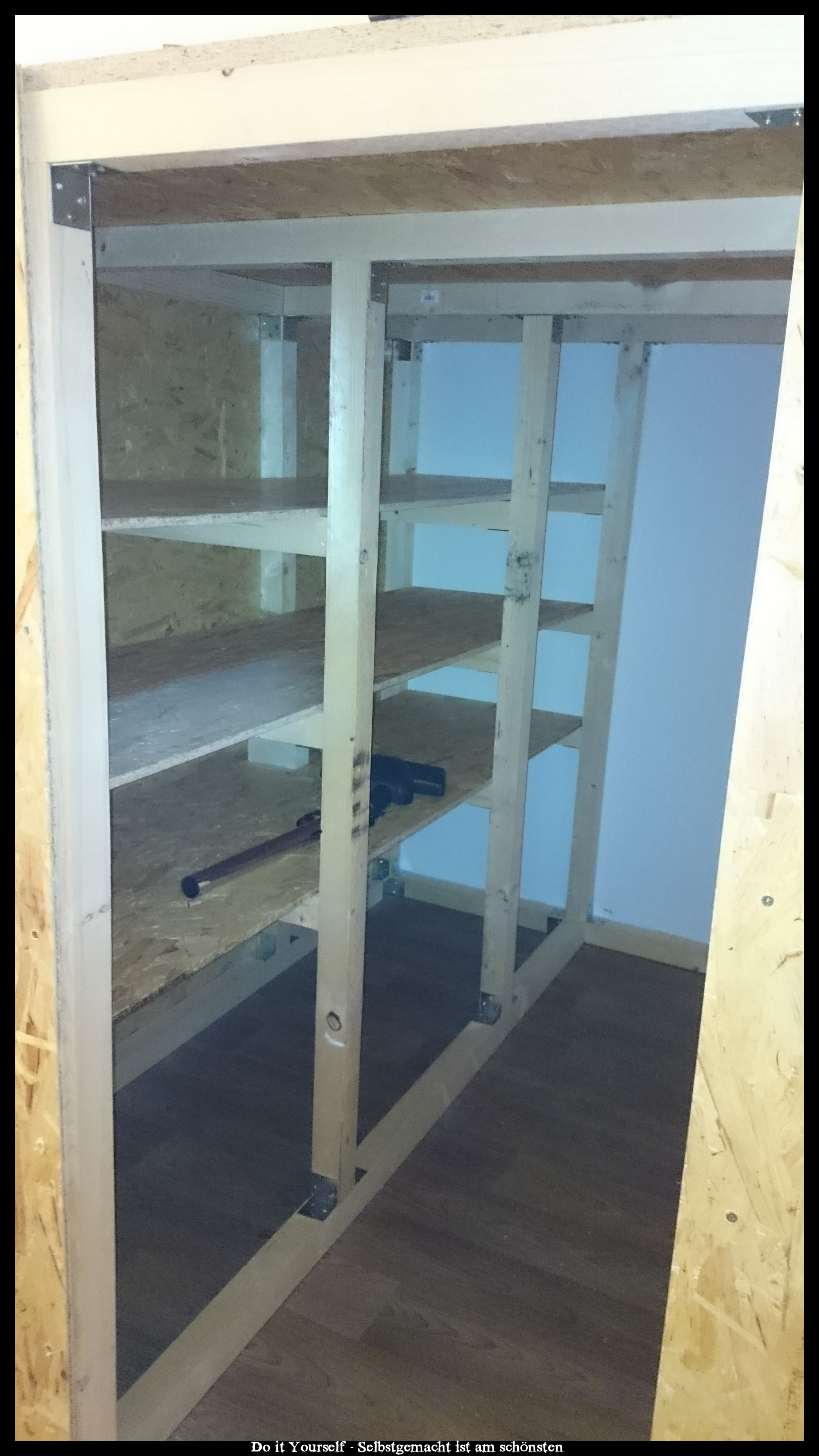 Die Regalböden bestehen aus 12mm OSB Platten, auf der anderen Seite haben wir einfach Löcher in die Querstreben gebohrt einen Besenstiel durchgesteckt, schon hatten wir eine Kleiderstange für die Bügel.