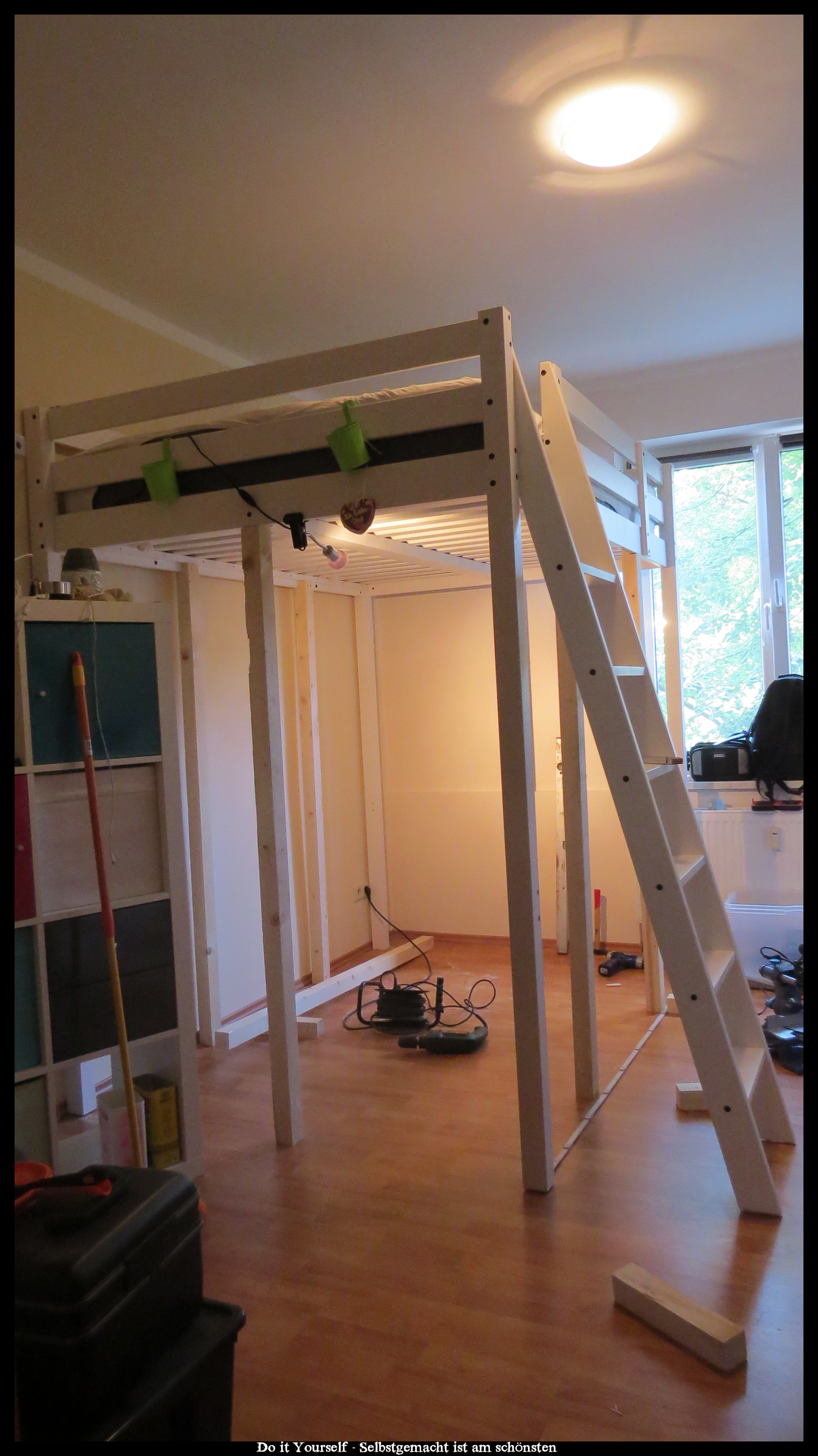 Als ich einem befreundeten Paar davon erzählte, das Ich ein Hochbett mit begehbaren Kleiderschrank für eine Freundin gebaut habe, kam die Frage auf, ob man das auch bei einem bereits bestehendem Hochbett einbauen könnte. Natürlich!