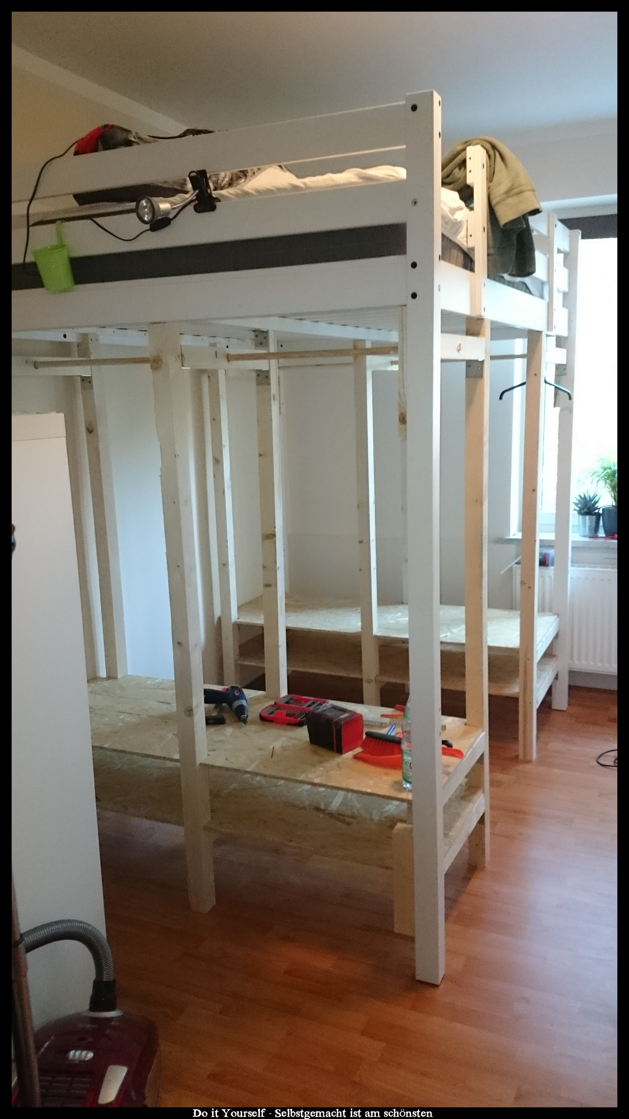 Als ich einem befreundeten Paar davon erzählte, das Ich ein Hochbett mit begehbaren Kleiderschrank für eine Freundin gebaut habe, kam die Frage auf, ob man das auch bei einem bereits bestehendem Hochbett einbauen könnte. Natürlich!