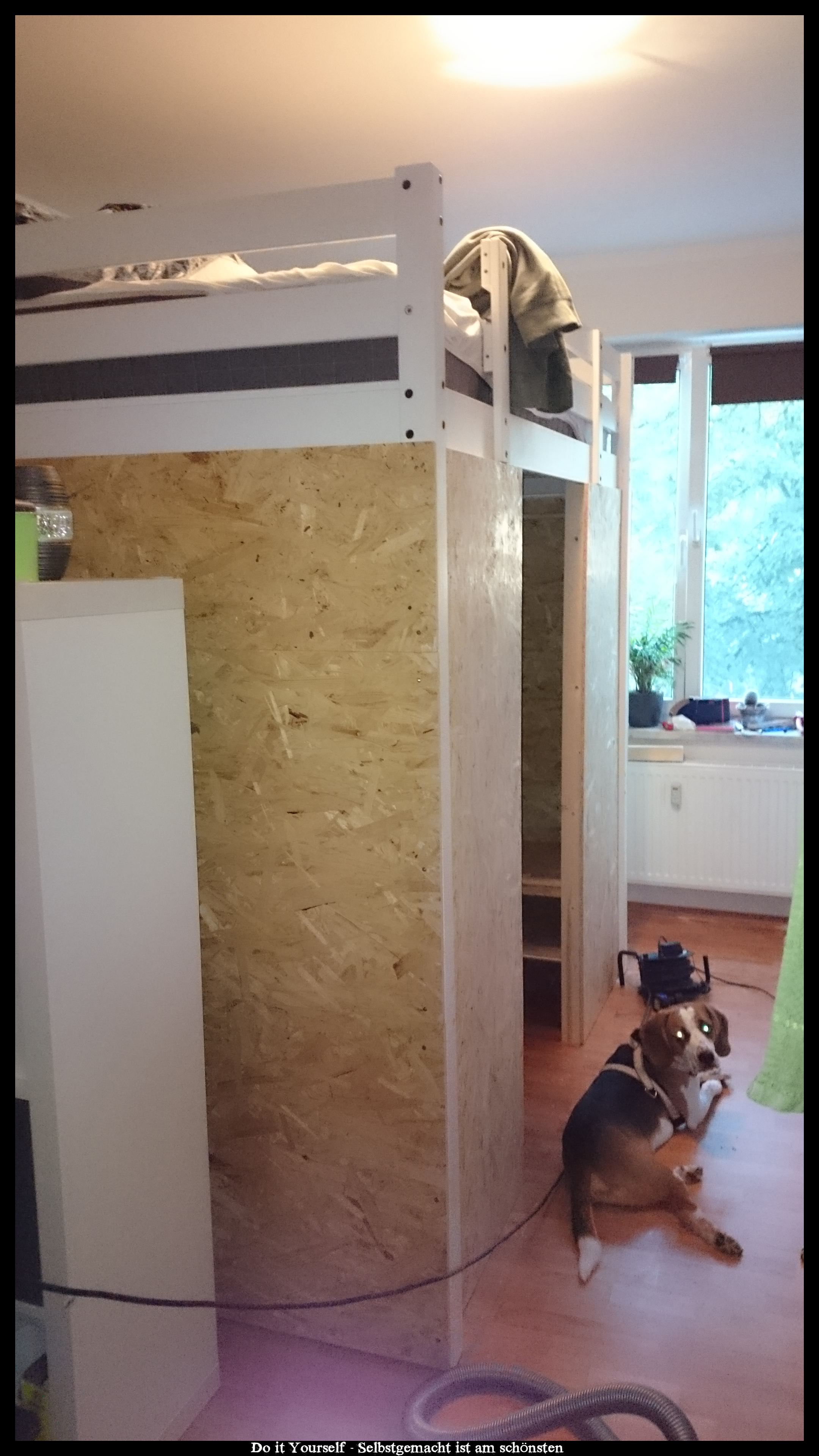 Als ich einem befreundeten Paar davon erzählte, das Ich ein Hochbett mit begehbaren Kleiderschrank für eine Freundin gebaut habe, kam die Frage auf, ob man das auch bei einem bereits bestehendem Hochbett einbauen könnte. Natürlich!