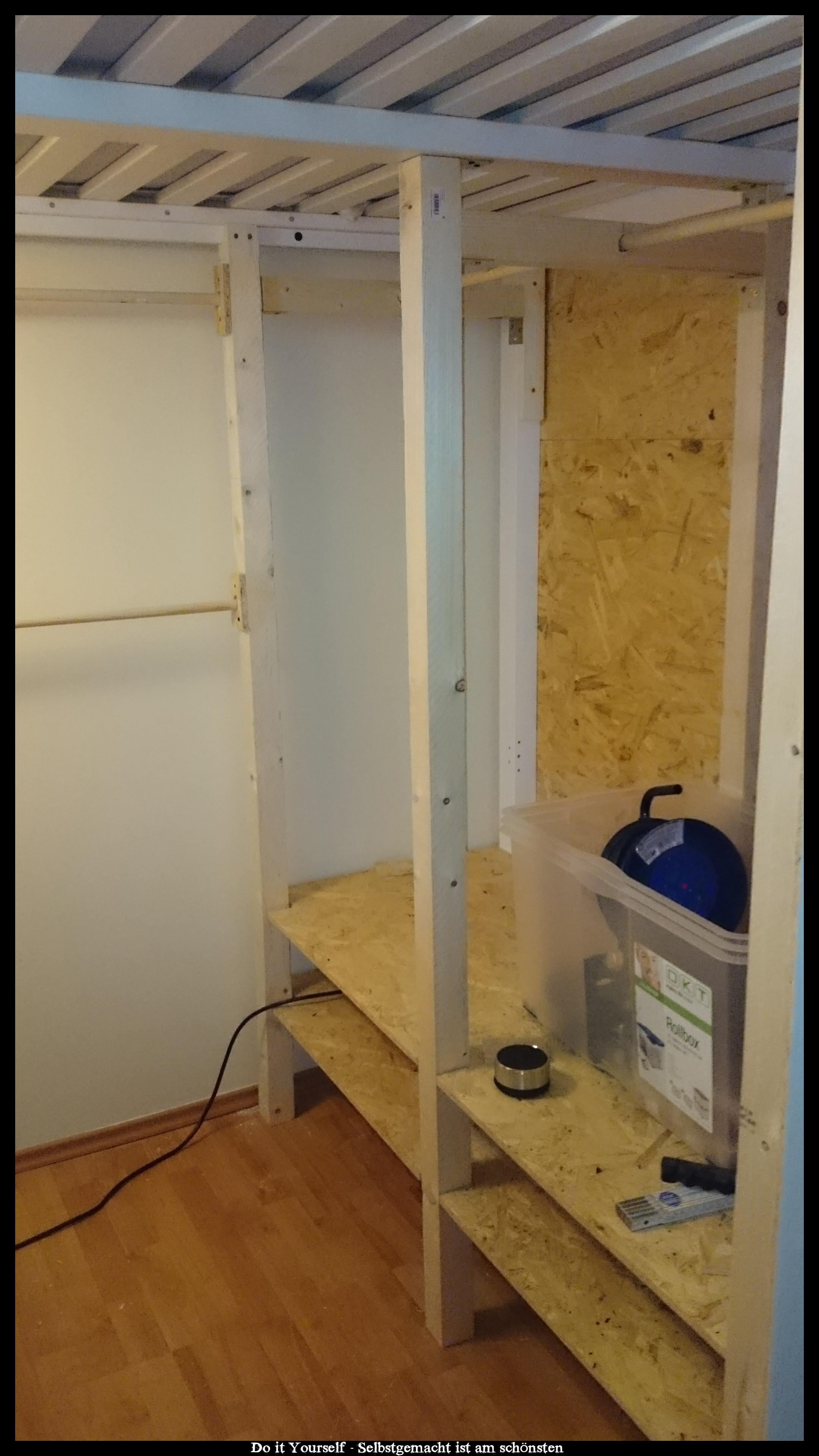 Als ich einem befreundeten Paar davon erzählte, das Ich ein Hochbett mit begehbaren Kleiderschrank für eine Freundin gebaut habe, kam die Frage auf, ob man das auch bei einem bereits bestehendem Hochbett einbauen könnte. Natürlich!