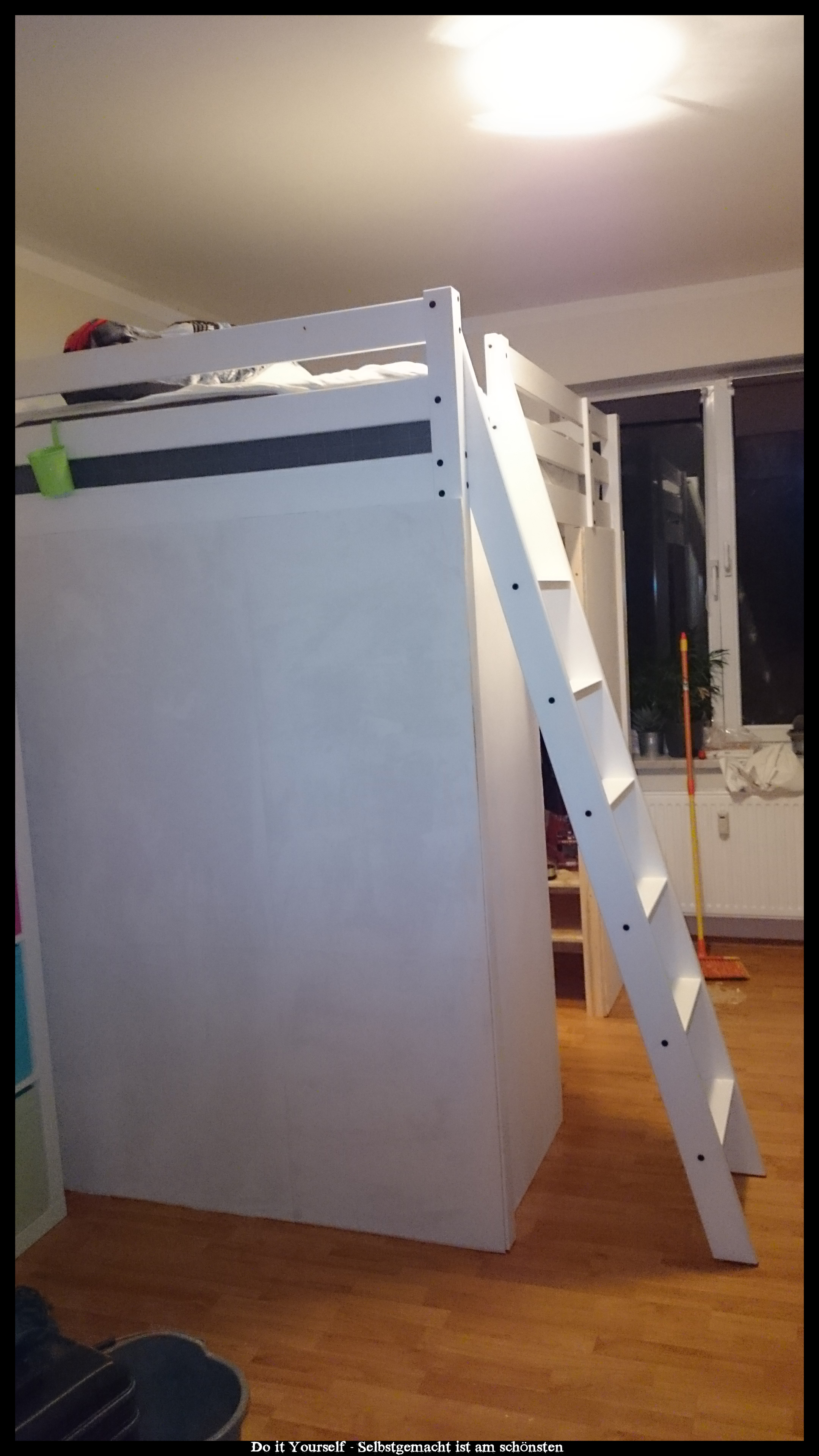 Als ich einem befreundeten Paar davon erzählte, das Ich ein Hochbett mit begehbaren Kleiderschrank für eine Freundin gebaut habe, kam die Frage auf, ob man das auch bei einem bereits bestehendem Hochbett einbauen könnte. Natürlich!