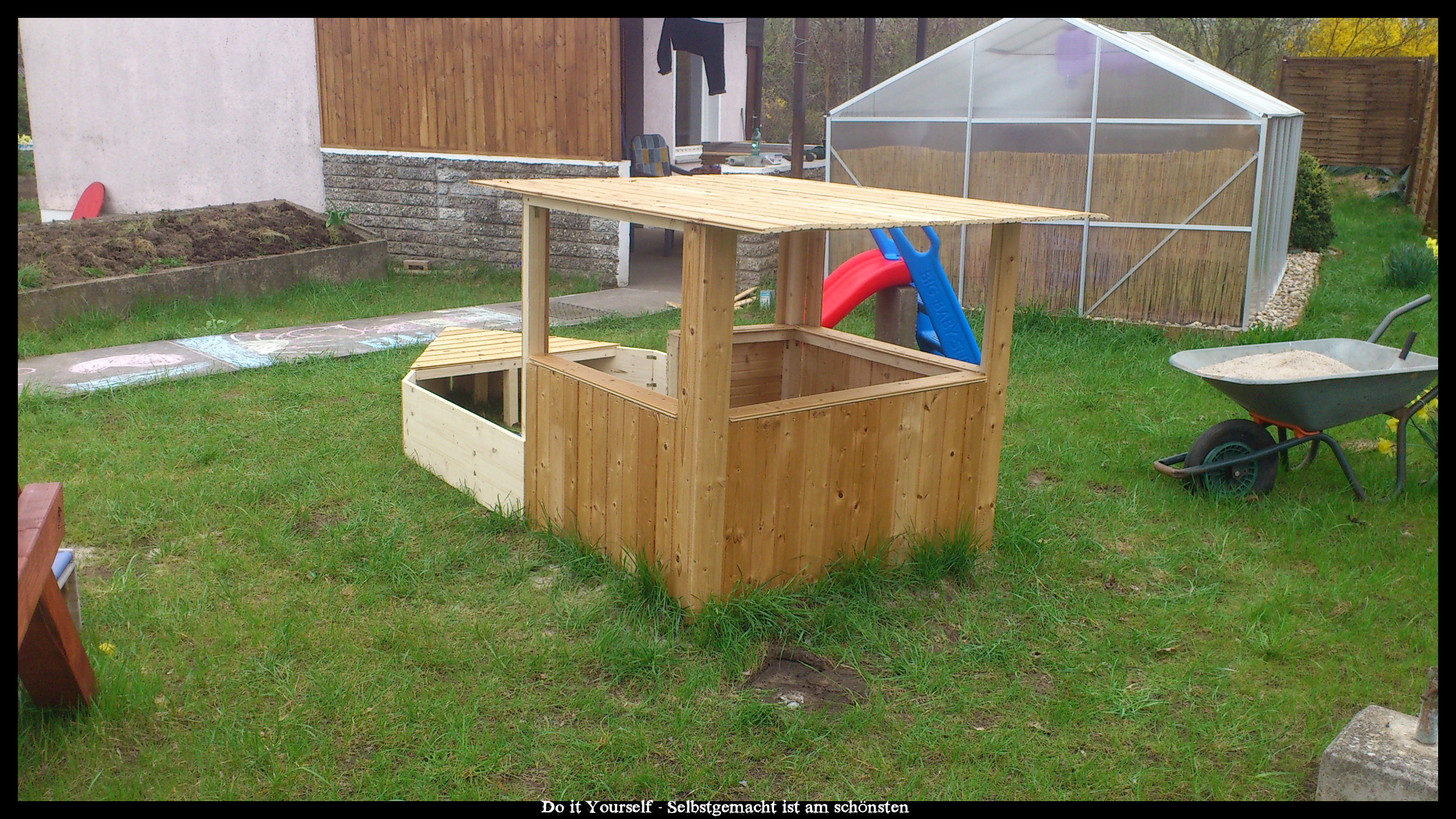 Für den Rahmen/Würfel habe ich 58 x 58 mm Balken genommen, die Wände sind aus einfachem Profilholz. Der Schiffsrumpf ist aus Schalbrettern und Profilholz. Das ganze noch schnell zusammen geschraubt und angestrichen, fertig !