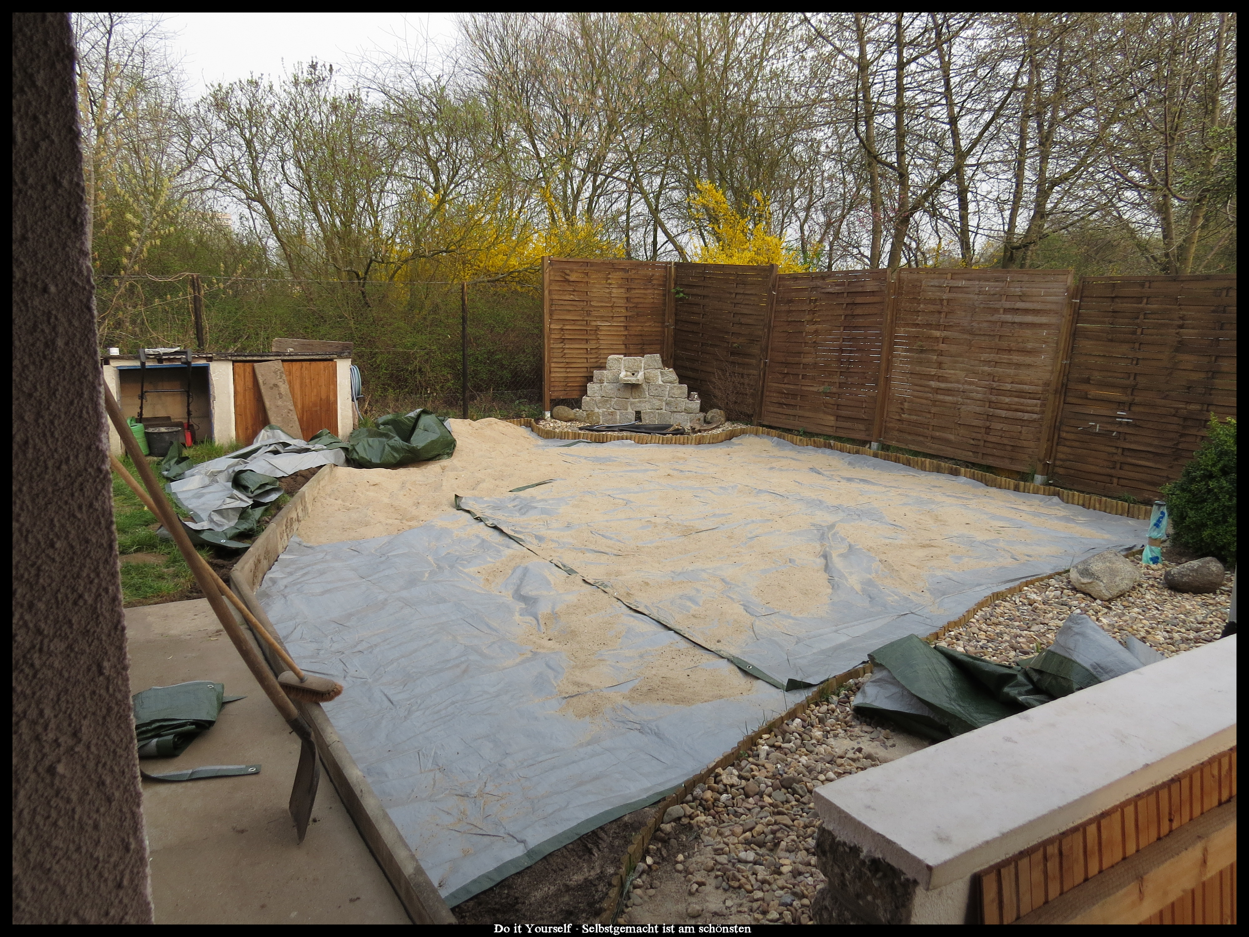 Was ihr dafür benötigt, ist eine Plane, die billigste die ihr finden könnt reicht völlig aus, Rasenkanntensteine oder ähnliches und bei ca. 35 qm Fläche sollten es schon ungefähr 3,5 Tonnen Sand sein, sonst wird euer Strand zu dünn, das macht dann auch keinen Spaß.