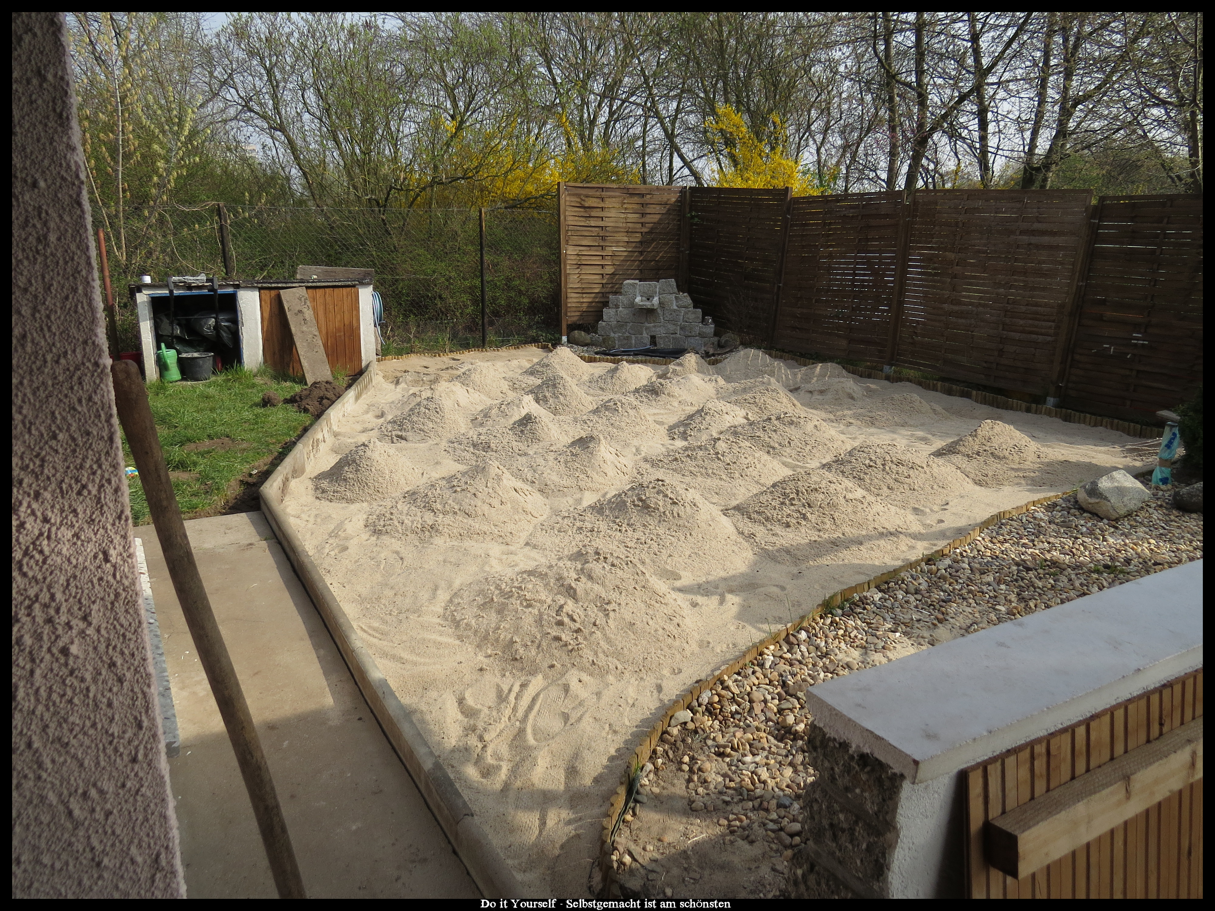 Was ihr dafür benötigt, ist eine Plane, die billigste die ihr finden könnt reicht völlig aus, Rasenkanntensteine oder ähnliches und bei ca. 35 qm Fläche sollten es schon ungefähr 3,5 Tonnen Sand sein, sonst wird euer Strand zu dünn, das macht dann auch keinen Spaß.