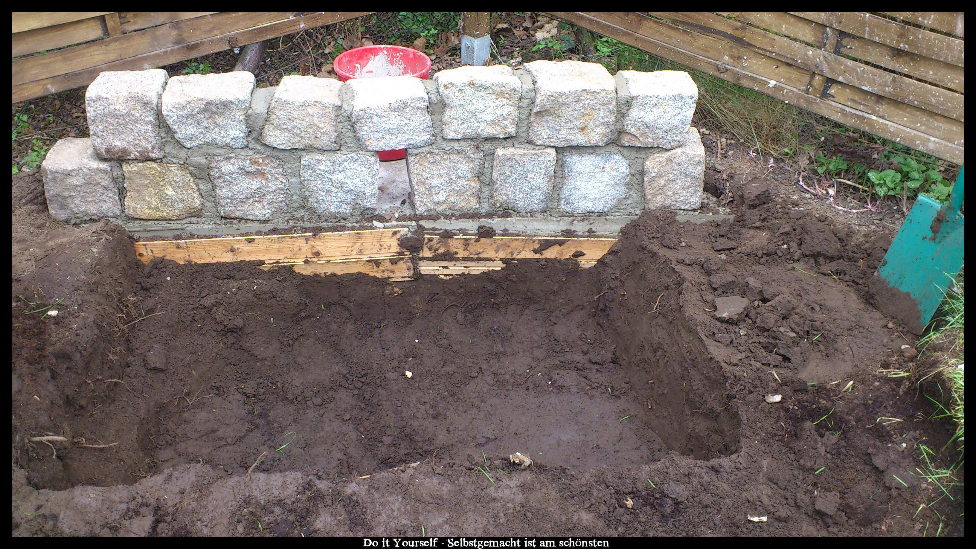 Dazu habe ich einfach eine Spatenbreite/-tiefe ausgehoben, ein paar alte Steine reingeschmissen und dann mit Estrichbeton ausgegossen. das ganze habe ich dann ca. eine Stunde anziehen lassen und die erste Schicht Granitsteine drauf gesetzt, damit das Fundament gleich ein wenig die Form der Steine annimmt. Danach habe ich dann immer mit ein paar Stunden Aushärtungszeit Stein auf Stein gesetzt, dazwischen immer Estrichbeton geschmiert und von außen geglättet.