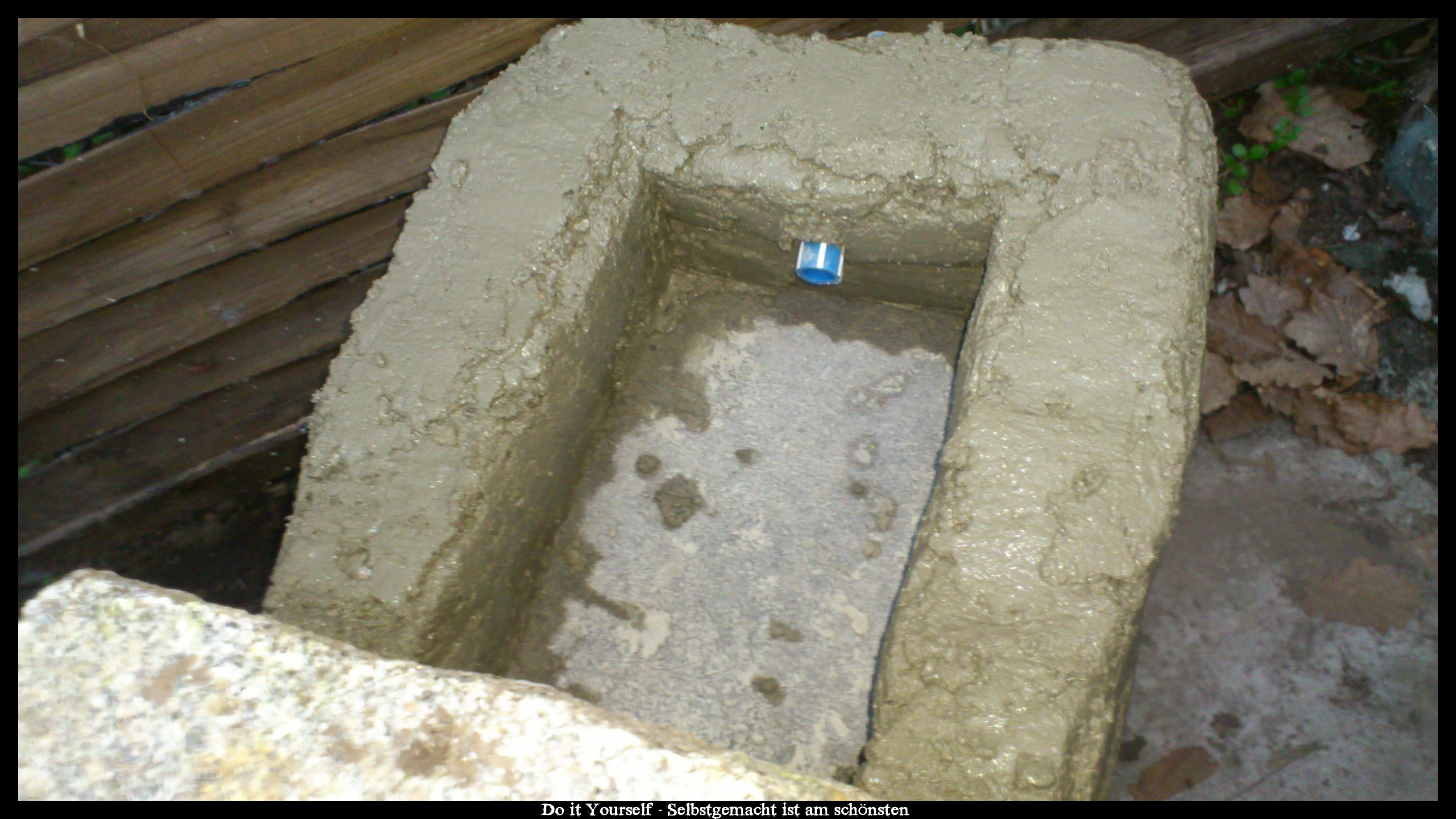 Hinter der Mauer habe ich dann auf dem Rasenkanntenstein ein Wulst aus Estrichbeton zu einer Kammer geformt und ein ein StĂĽck Gartenschlauch gesteckt.