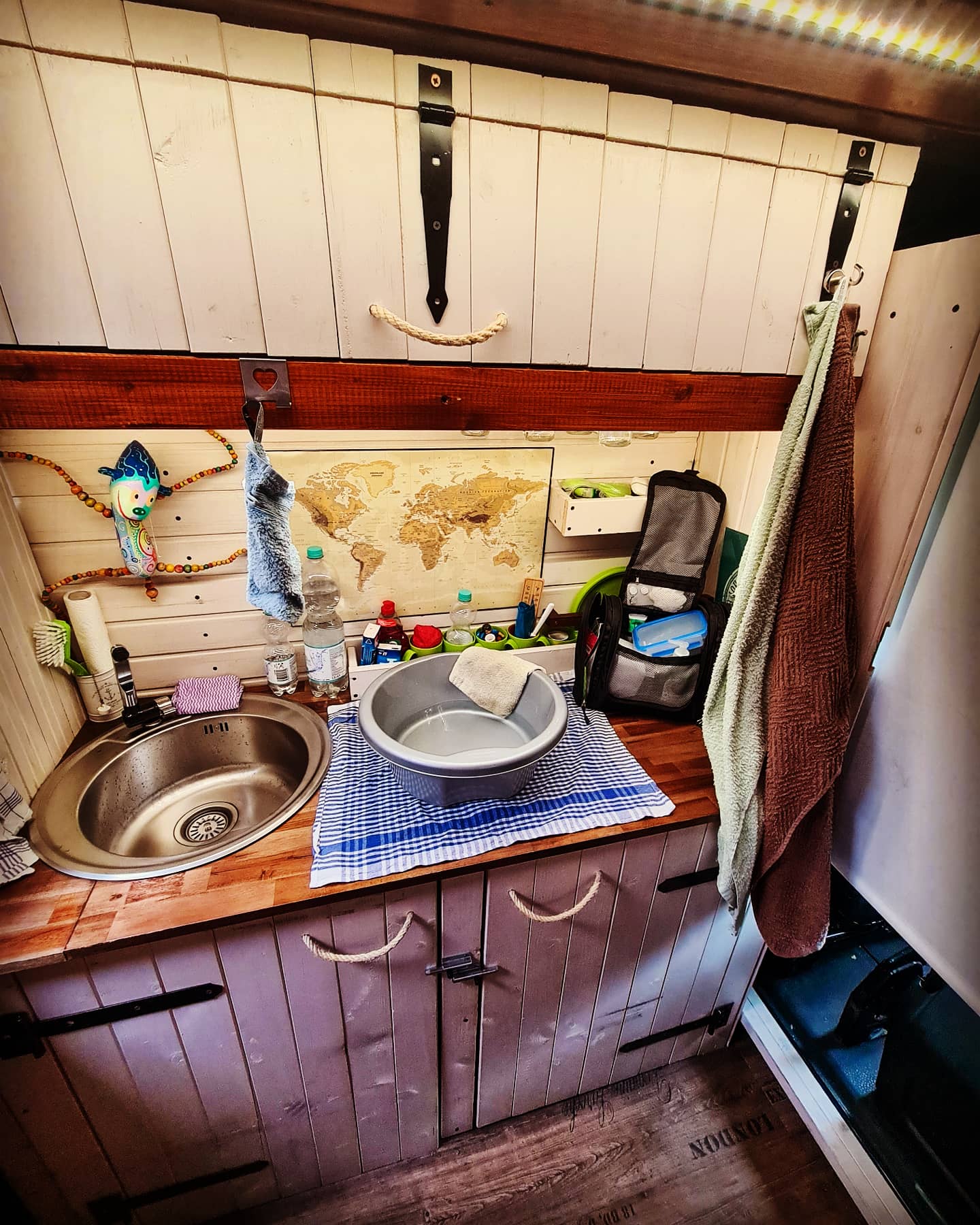 So wird aus der Küche kurzerhand einfach das Badezimmer. Die Bad Utensilien sind eh immer in einer separaten Tasche verpackt.