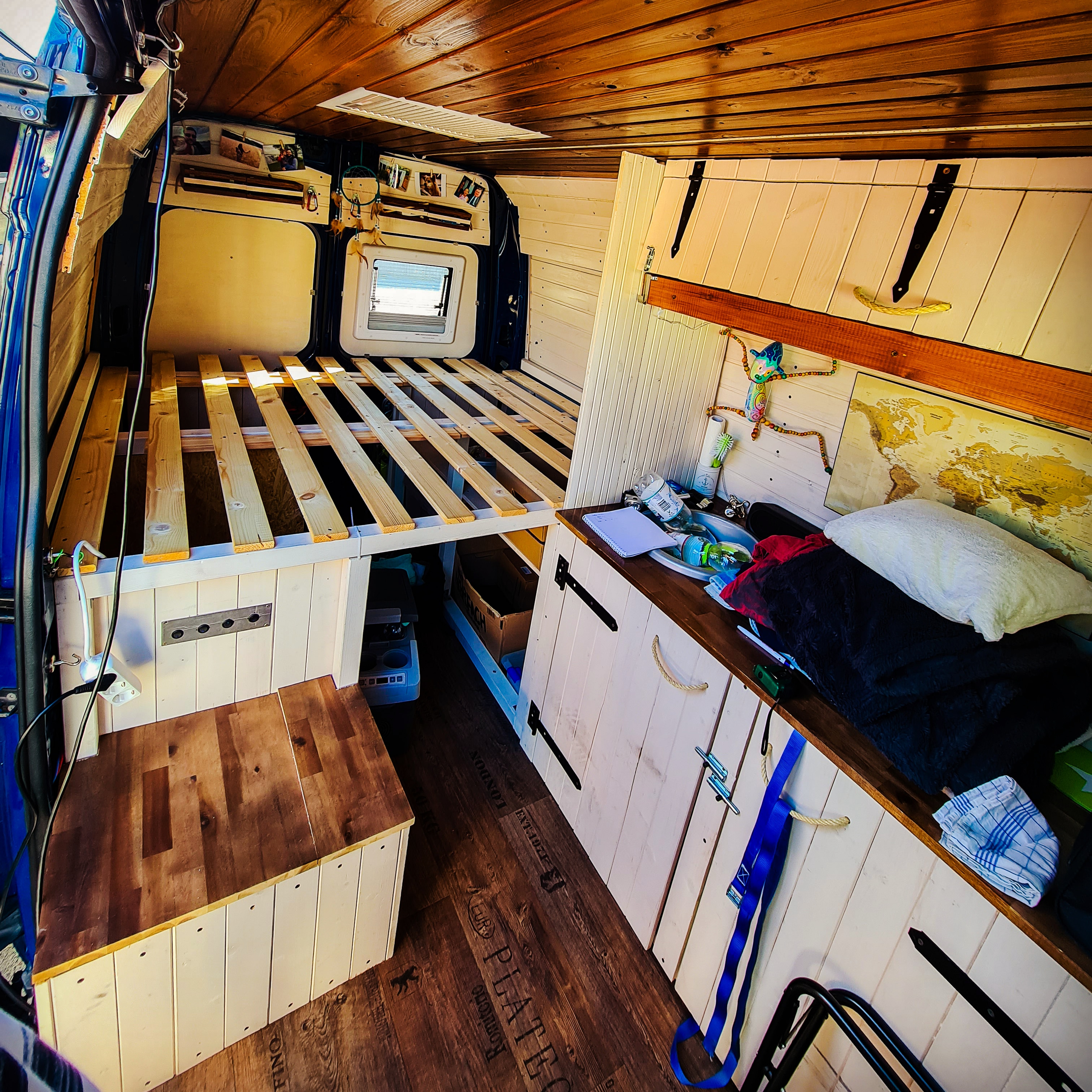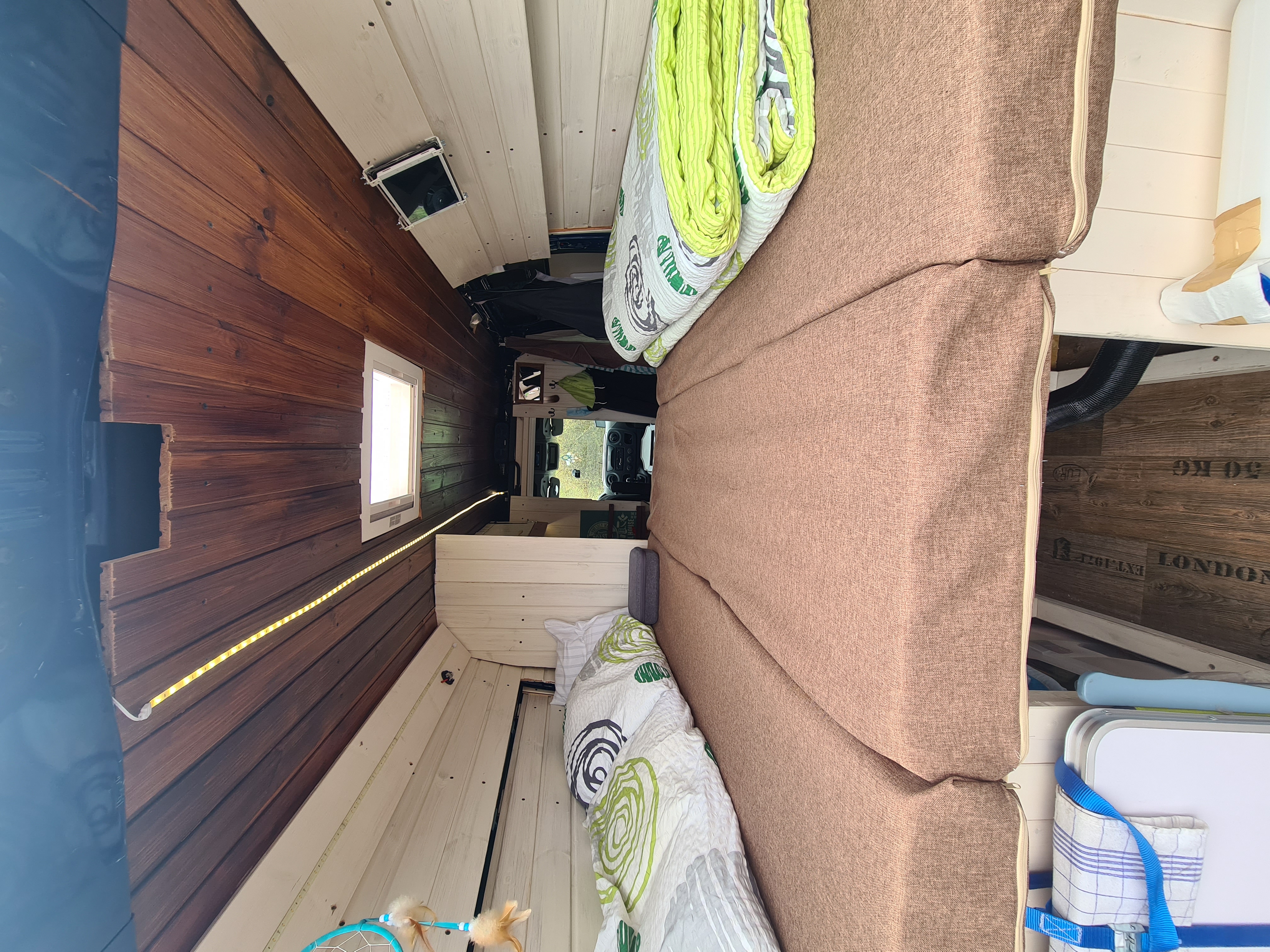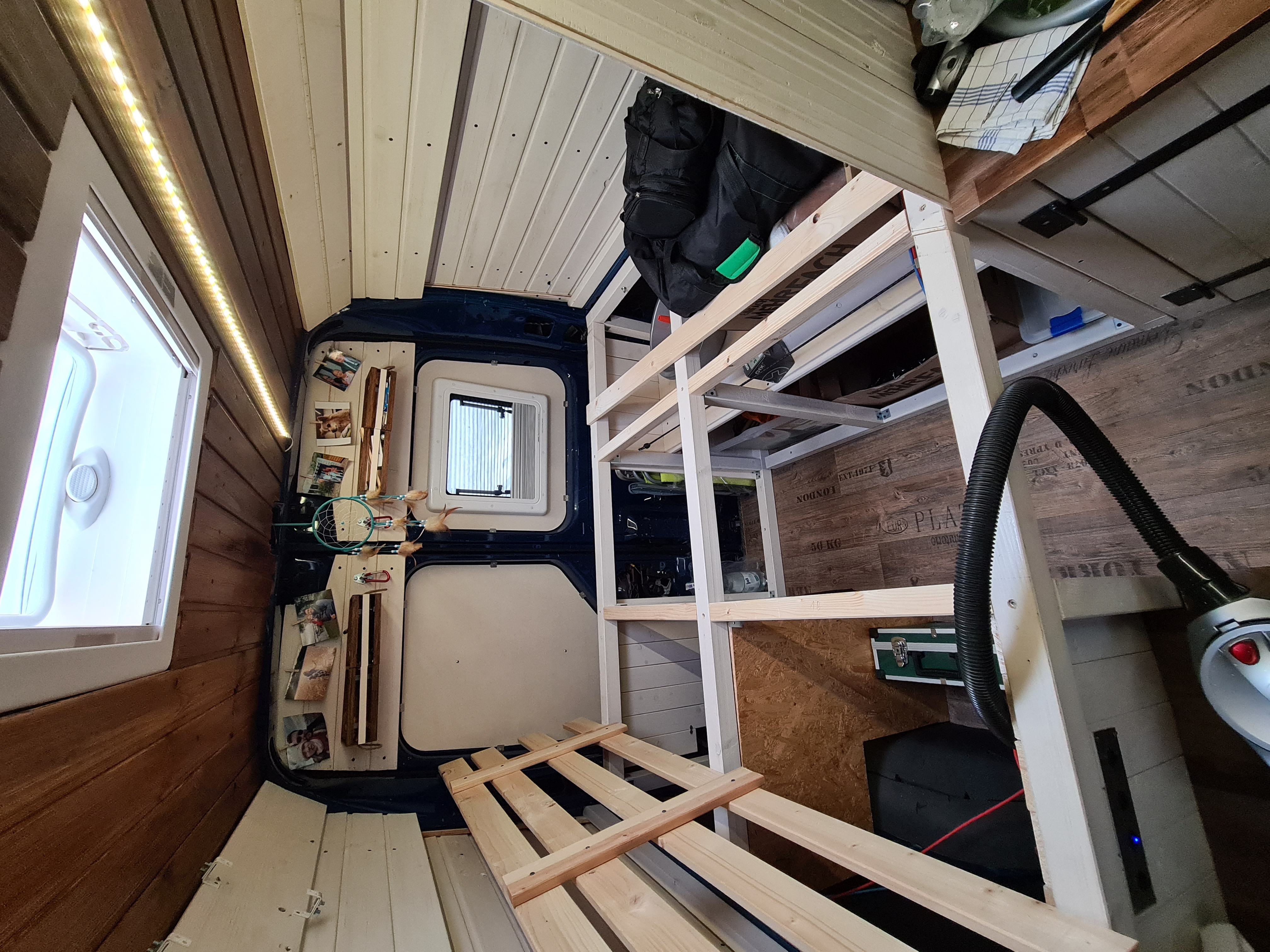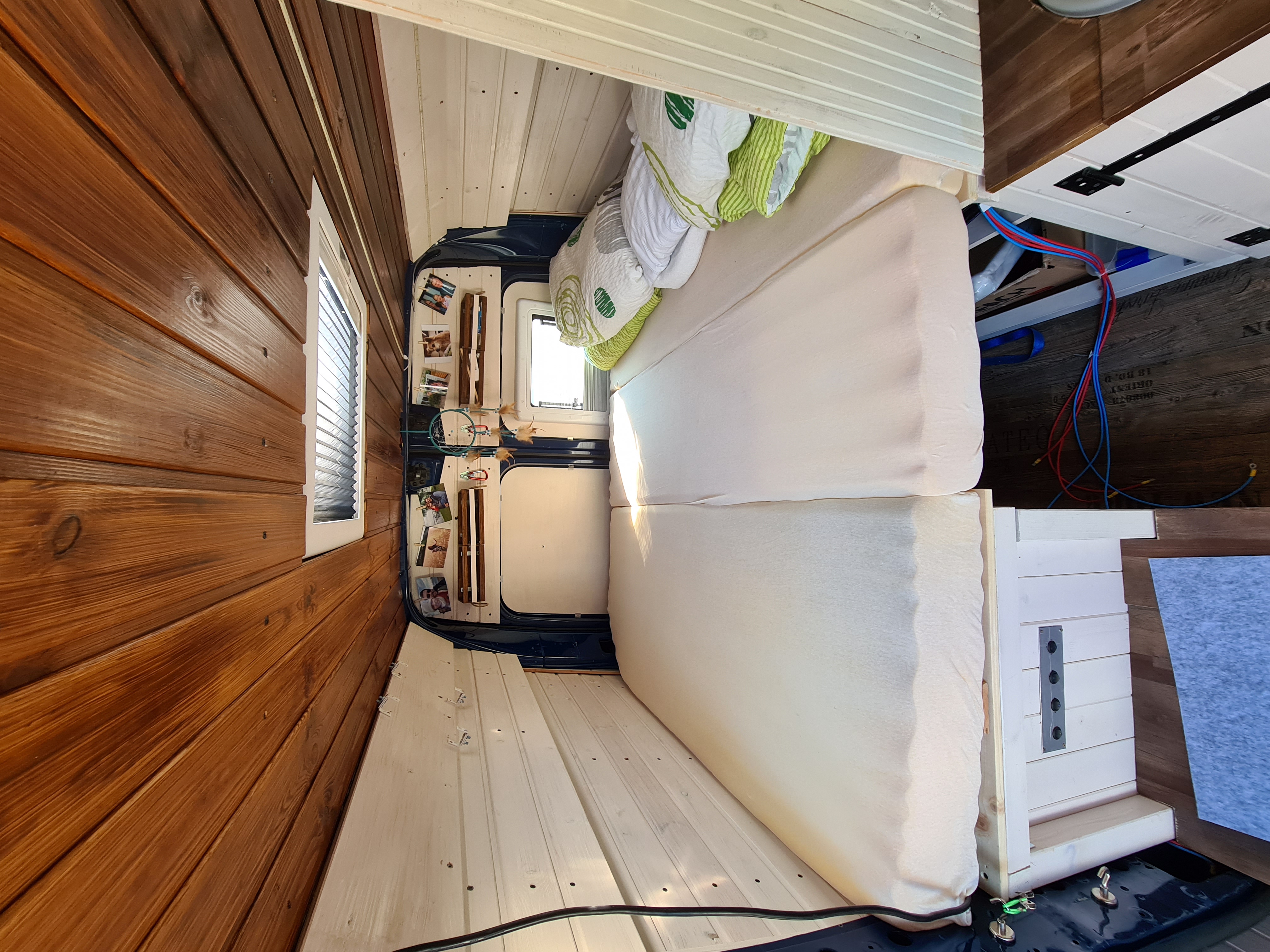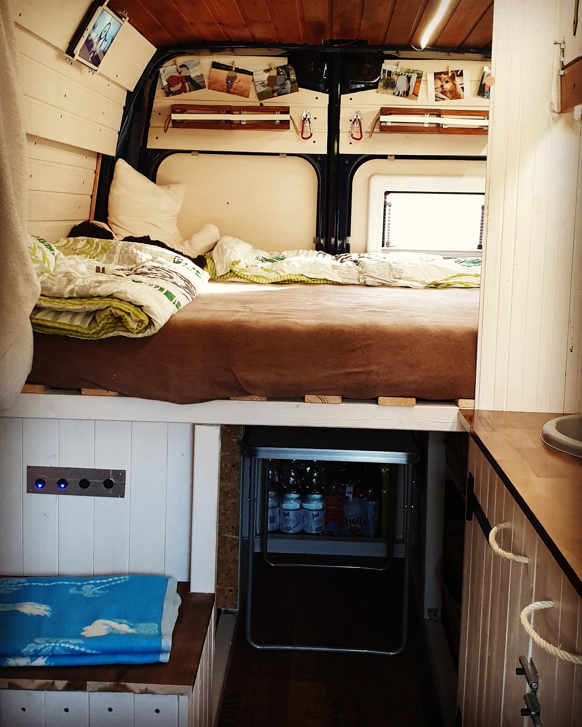 Das Bett wurde dann 2021 nochmal optimiert. Ich habe den Durchgang aufgemacht, damit man das Bett auch mal beiseite tun kann und der Gang begehrbar wird.